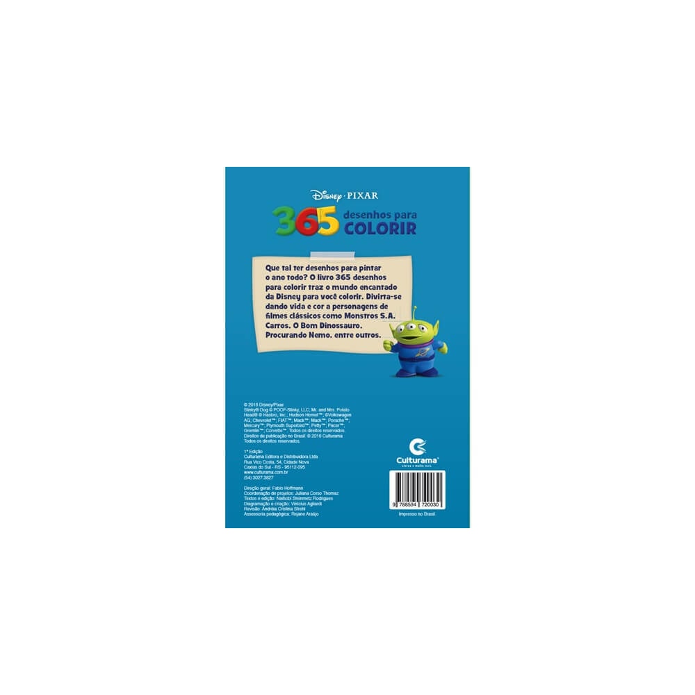 Colorir é uma das atividades preferidas das crianças. Este livro vem com 365 desenhos, um para cada dia do ano. São personagens como Relâmpago McQueen, Matte, Woody, Buzz, Nemo, Dory, entre outros.