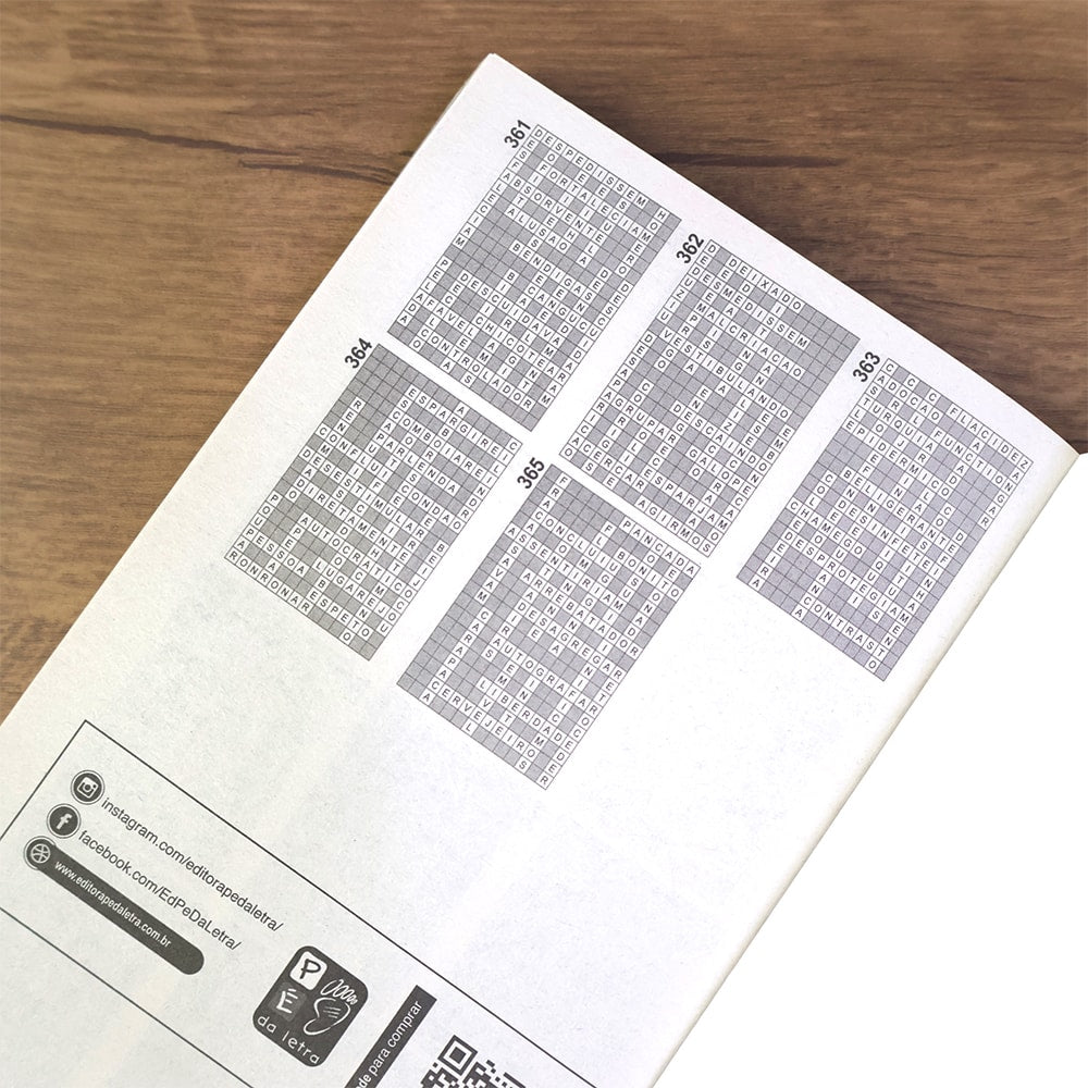 O livro 365 caça palavras, conta com mais de 5000 palavras bíblicas em diferentes níveis de dificuldade.