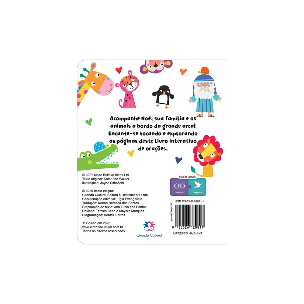 Acompanhe Noé, sua família e os animais a bordo da grande arca! Encontre-se tocando e explorando as páginas deste livro interativo de orações! Ah... e ainda seu pequeno pode levar para onde quiser, pois possui uma alça como uma maleta ou seja são histórias bíblicas com alça!