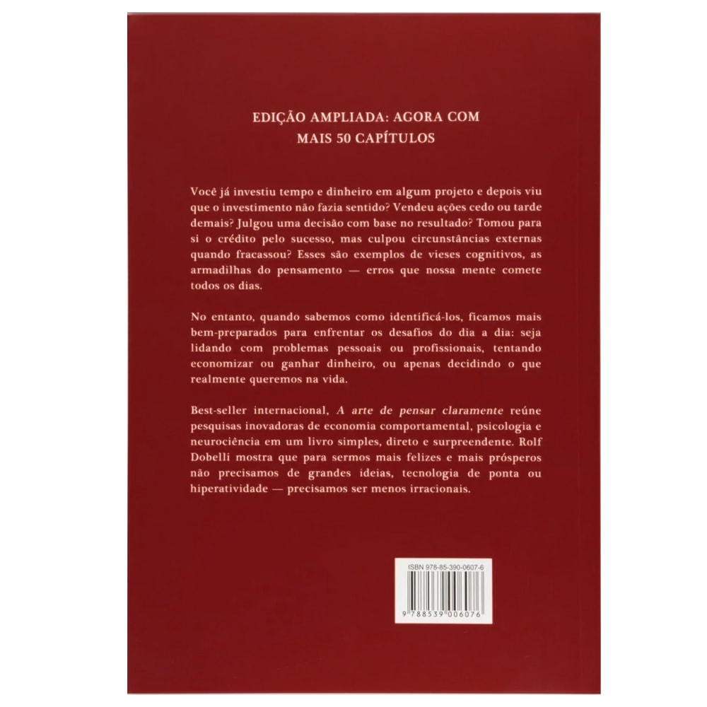 Já investiu em projetos que não deram certo, vendeu ações na hora errada ou culpou fatores externos pelo fracasso? Esses são exemplos de vieses cognitivos, erros diários da nossa mente. Ao identificá-los, ficamos mais preparados para lidar com os desafios, seja no trabalho, na vida pessoal ou nas finanças. Em A Arte de Pensar Claramente, Rolf Dobelli reúne pesquisas de economia comportamental, psicologia e neurociência, mostrando que para sermos mais felizes e prósperos, não precisamos de grandes ideias, mas sim de menos irracionalidade.