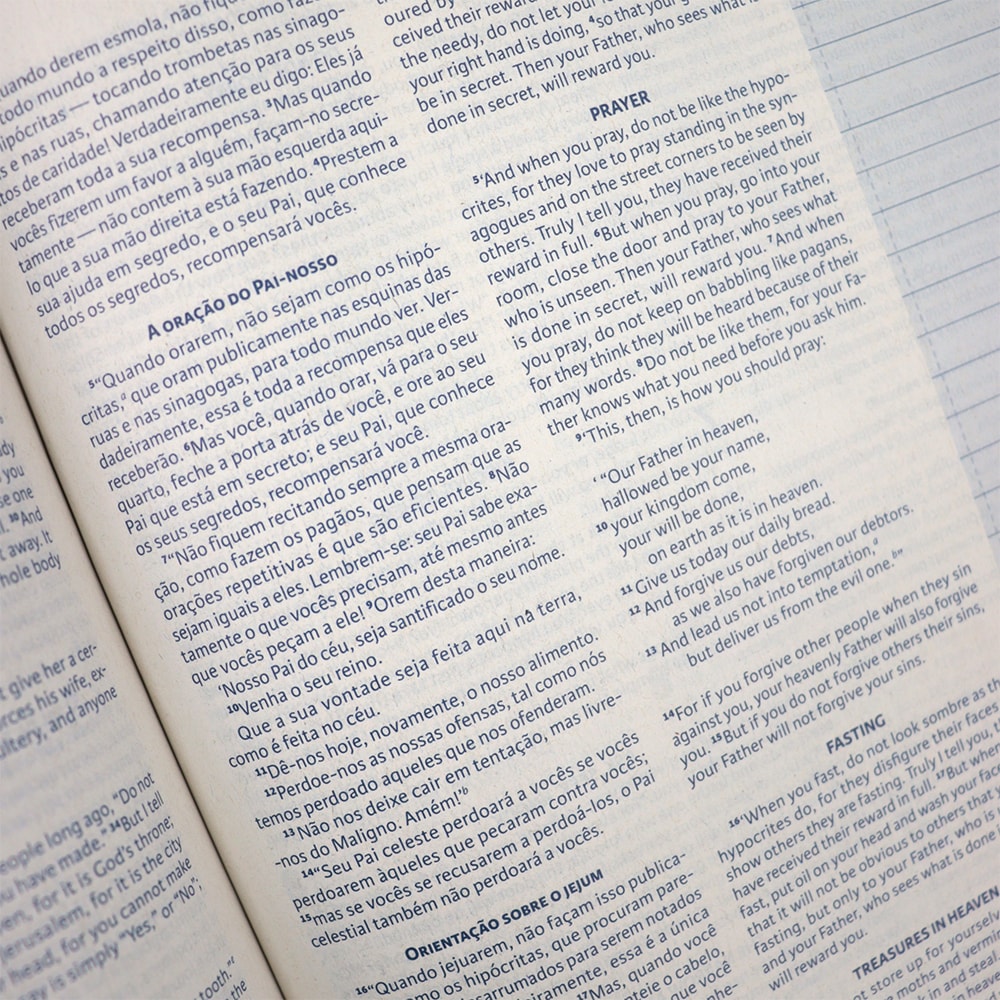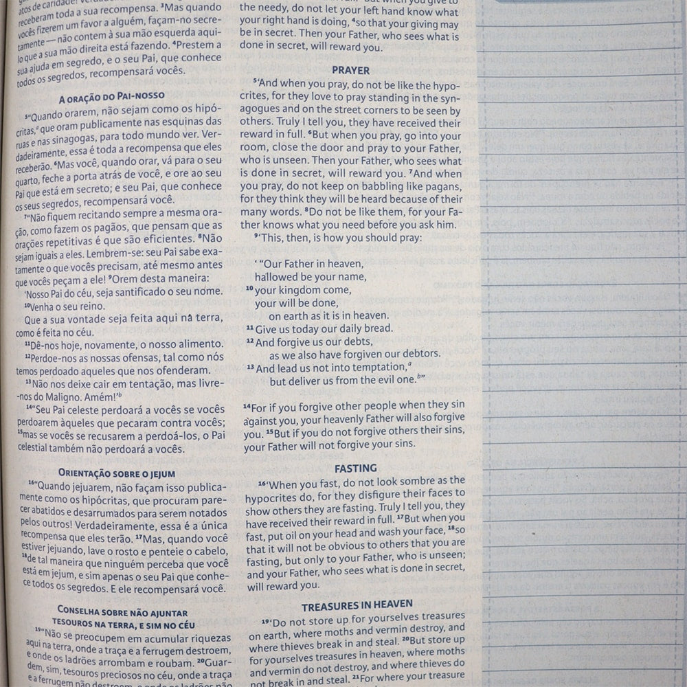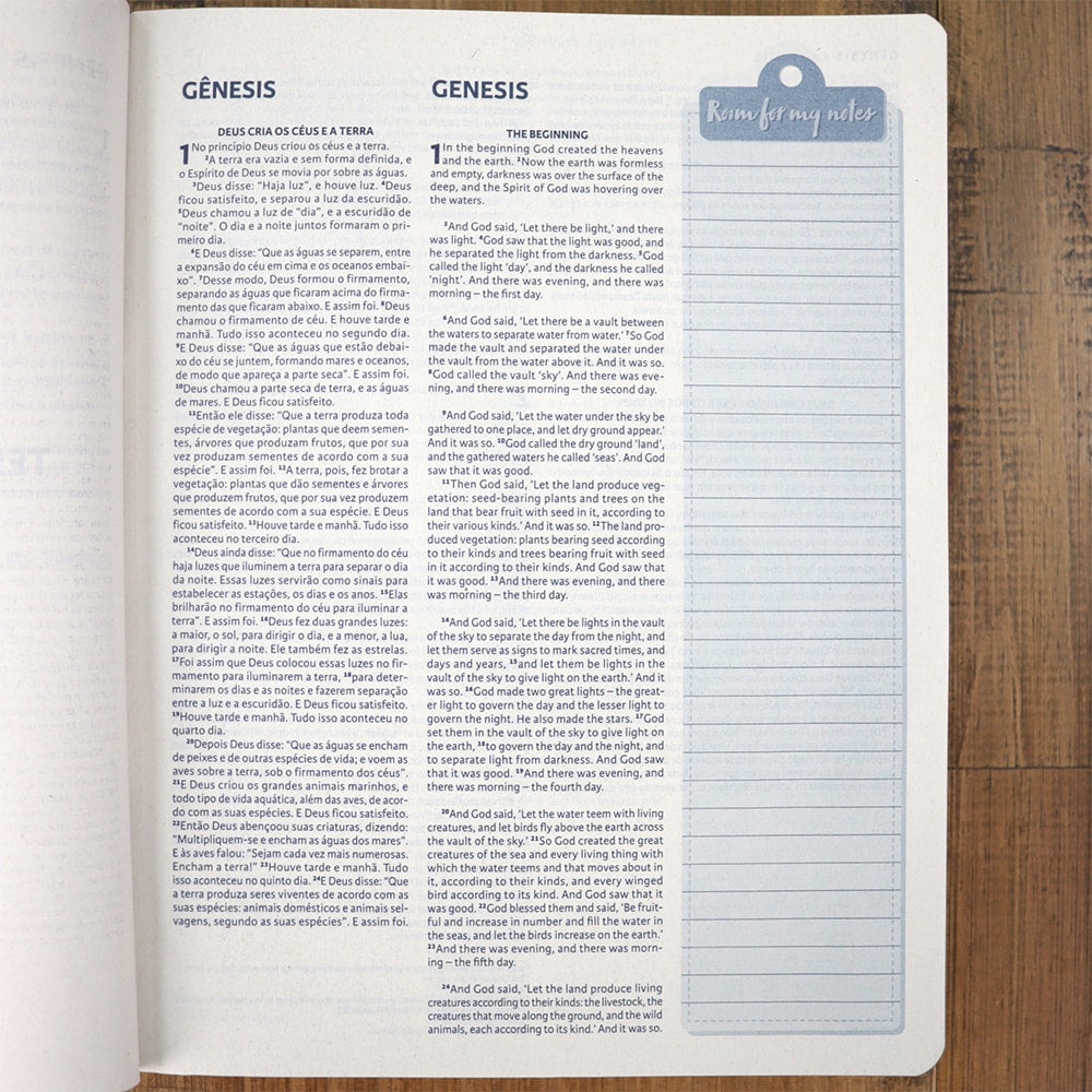 Seja para anotar passagens inspiradoras, esclarecer dúvidas de inglês durante o estudo bíblico ou registrar reflexões pessoais, este espaço para personalização torna a Bíblia Bilíngue NBV-NIV uma companheira indispensável para qualquer estudante da Palavra de Deus. Permita-se mergulhar mais fundo na Palavra, conectando-se não apenas com o texto sagrado, mas também com suas próprias reflexões e aprendizados pessoais.