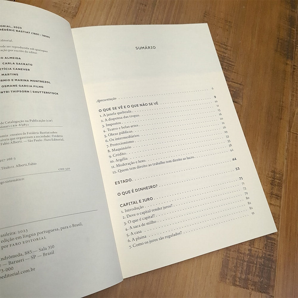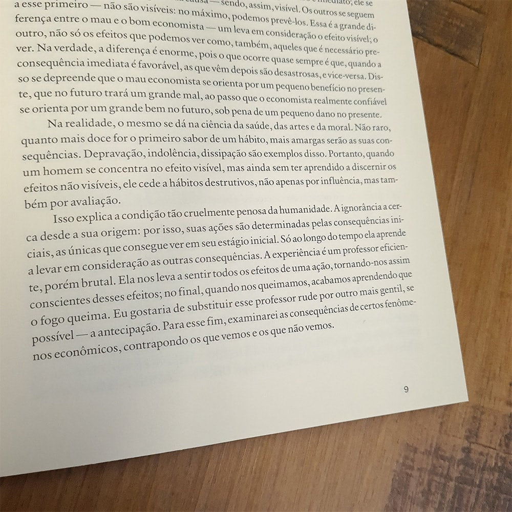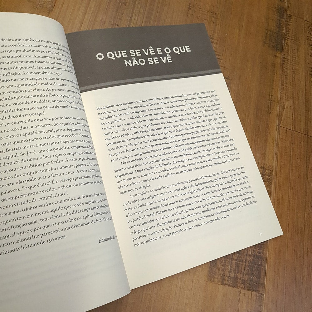 Retirando a economia do campo das abstrações mirabolantes, fórmulas matemáticas e conceitos mágicos, Bastiat a devolve ao concretismo da vida diária que todos padecemos. Ele expõe seus argumentos com exemplos corriqueiros e utilizando a linguagem clara, de modo a oferecer ao público não acadêmico, lições sobre as consequências invisíveis da imprudência econômica, o verdadeiro papel do Estado, a diferença entre o dinheiro e riqueza, a natureza do capital e a justiça dos juros.