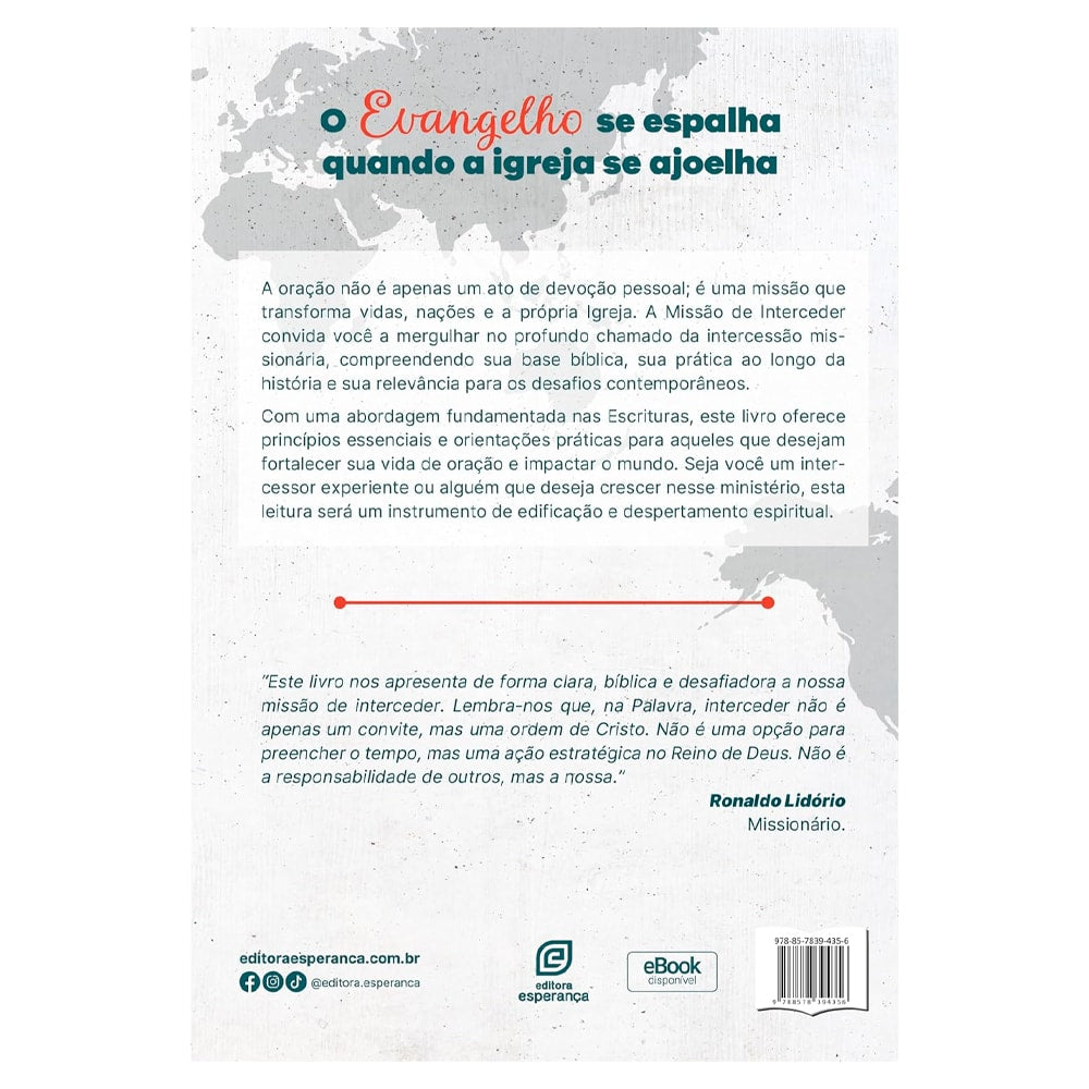 “Este livro nos apresenta de forma clara, bíblica e desafiadora a nossa missão de interceder. Lembra-nos que, na Palavra, interceder não é apenas um convite, mas uma ordem de Cristo. Não é uma opção para preencher o tempo, mas uma ação estratégica no Reino de Deus. Não é a responsabilidade de outros, mas a nossa.” Ronaldo Lidório - Missionário.