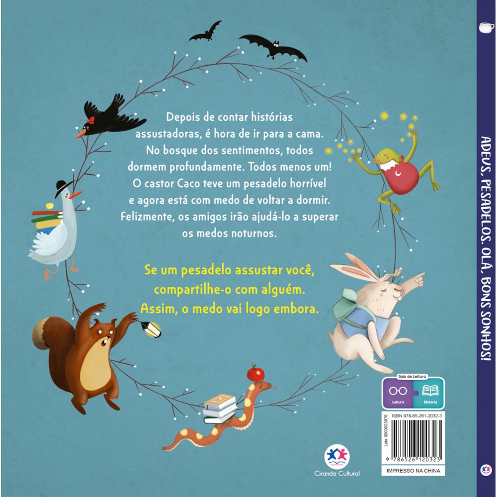 Depois de uma noite de histórias assustadoras, o bosque dos sentimentos está em silêncio — todo mundo dorme tranquilo. Todo mundo, menos o castor Caco. Um pesadelo terrível o acordou, e agora ele está com medo de voltar a dormir. Mas Caco não está sozinho: com a ajuda dos amigos, ele vai descobrir que dividir o que sentimos é uma forma poderosa de espantar o medo. Porque quando a gente fala sobre os pesadelos, eles logo perdem a força.