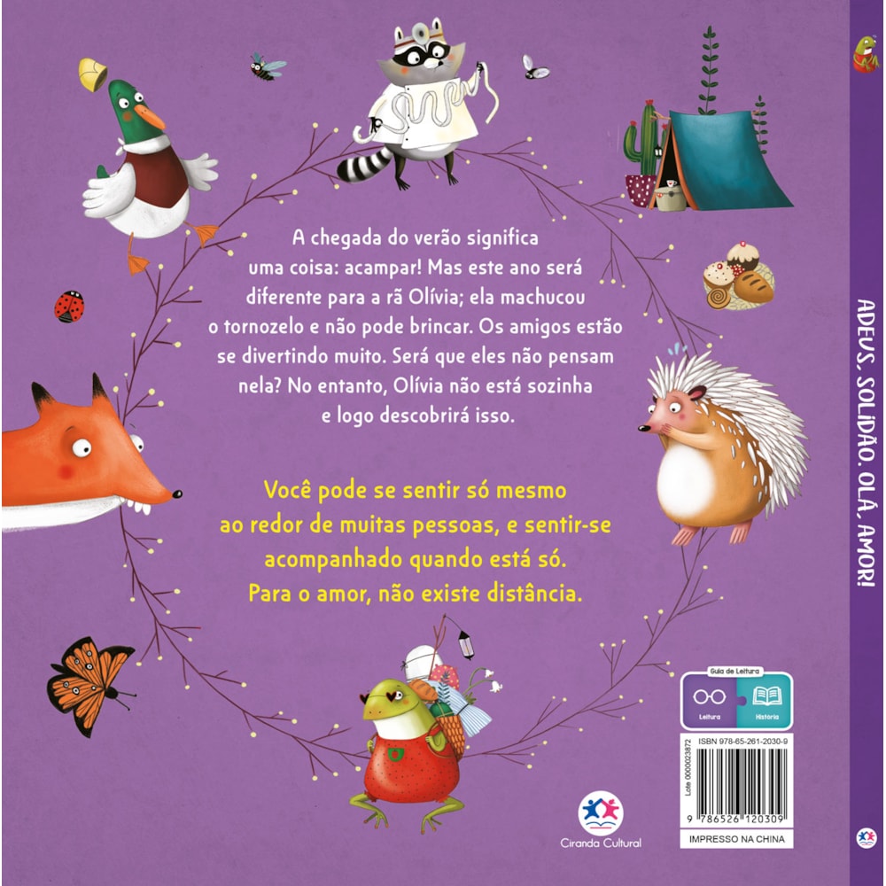 O verão chegou, e com ele, o tão esperado acampamento! Todos estão animados — menos Olívia, a rã. Com o tornozelo machucado, ela não pode correr, brincar nem acompanhar os amigos. Enquanto eles se divertem, Olívia começa a se sentir esquecida… Será que ninguém percebe como ela está se sentindo? Mas, aos poucos, ela vai descobrir que, mesmo nos momentos de solidão, o carinho verdadeiro encontra jeitos de chegar até a gente. Porque estar junto não é só estar por perto — é também saber cuidar, mesmo à distância.