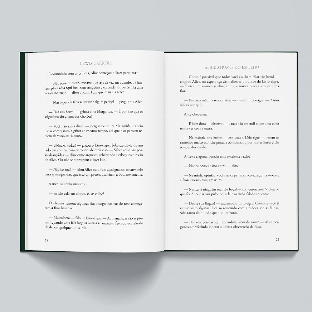 Nessa terra repleta de criaturas extraordinárias, tudo parece estar de ponta-cabeça, incluindo a lógica tal como a conhecemos. Comemoram-se desaniversários, correr muito o mantém no mesmo lugar e as memórias incluem fatos do futuro. É nesse universo desconcertante e repleto de poesia e fantasia que Alice vive novas aventuras, dessa vez, em um tabuleiro de xadrez vivo. A cada jogada, um novo desafio surreal demonstra, mais uma vez, a engenhosidade de Lewis Carroll em construir uma das obras mais majestosas da literatura universal.