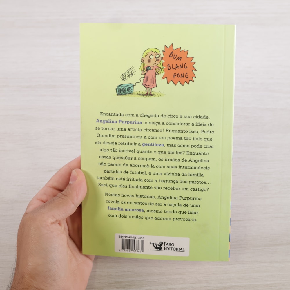 Encantada com a chegada do circo à sua cidade, Angelina Purpurina começa a considerar a ideia de se tornar uma artista circense! Enquanto isso, Pedro Quindin presenteou-a com um poema tão belo que ela deseja retribuir a gentileza, mas como pode criar algo tão incrível quanto o que ele fez? Enquanto essas questões a ocupam, os irmãos de Angelina não param de aborrecê-la com suas intermináveis partidas de futebol, e uma vizinha da família também está irritada com a bagunça dos garotos. Será que eles finalmente vão receber um castigo? Nestas novas histórias, Angelina Purpurina revela os encantos de ser a caçula de uma família amorosa, mesmo tendo que lidar com dois irmãos que adoram provocá-la.