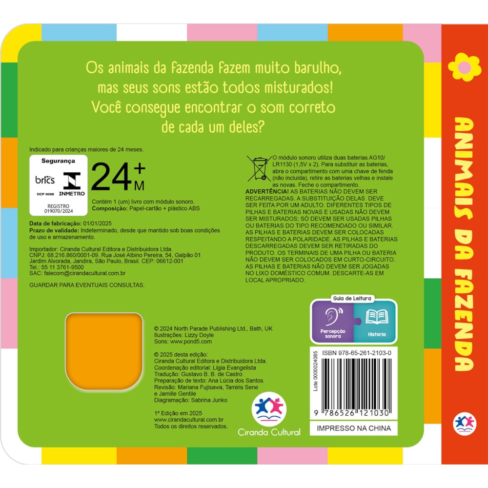 A fazenda está em festa — mas que barulheira! Os animais estão fazendo muitos sons… só que todos estão trocados! Será que você consegue descobrir qual barulho pertence a cada um? Neste livro interativo e colorido, a criança se diverte apertando os botões e combinando os sons com os animais certos da fazenda. E quando a bateria acabar, é só trocar — a diversão continua sem parar!