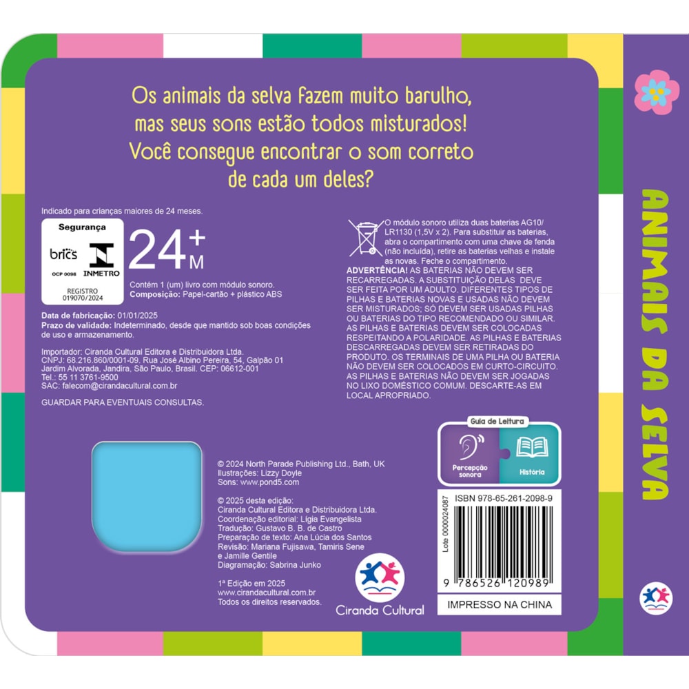 A selva está cheia de sons divertidos — mas todos estão embaralhados! Os animais estão fazendo a maior algazarra, e agora ninguém sabe mais que som pertence a quem! Será que você consegue ajudar a descobrir o barulho certo de cada um? Com botões sonoros e ilustrações coloridas, este livro é uma aventura interativa que encanta os pequenos e estimula a escuta e a atenção. Ah, e quando a bateria acabar, é só trocar — a diversão continua sem parar!