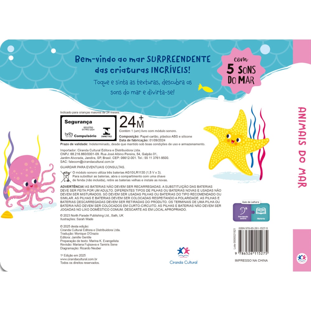 Bem-vindo ao mar surpreendente das criaturas incríveis! Toque e sinta as texturas, descubra os sons do mar e divirta-se! Com 5 sons incríveis, conte a história e a cada página mostre o som para seu pequeno ou deixe ele descobrir, sentir tornando o momento ainda mais divertido e interativo. E não se preocupe: se a bateria acabar, é só trocar e a diversão continua sem parar!