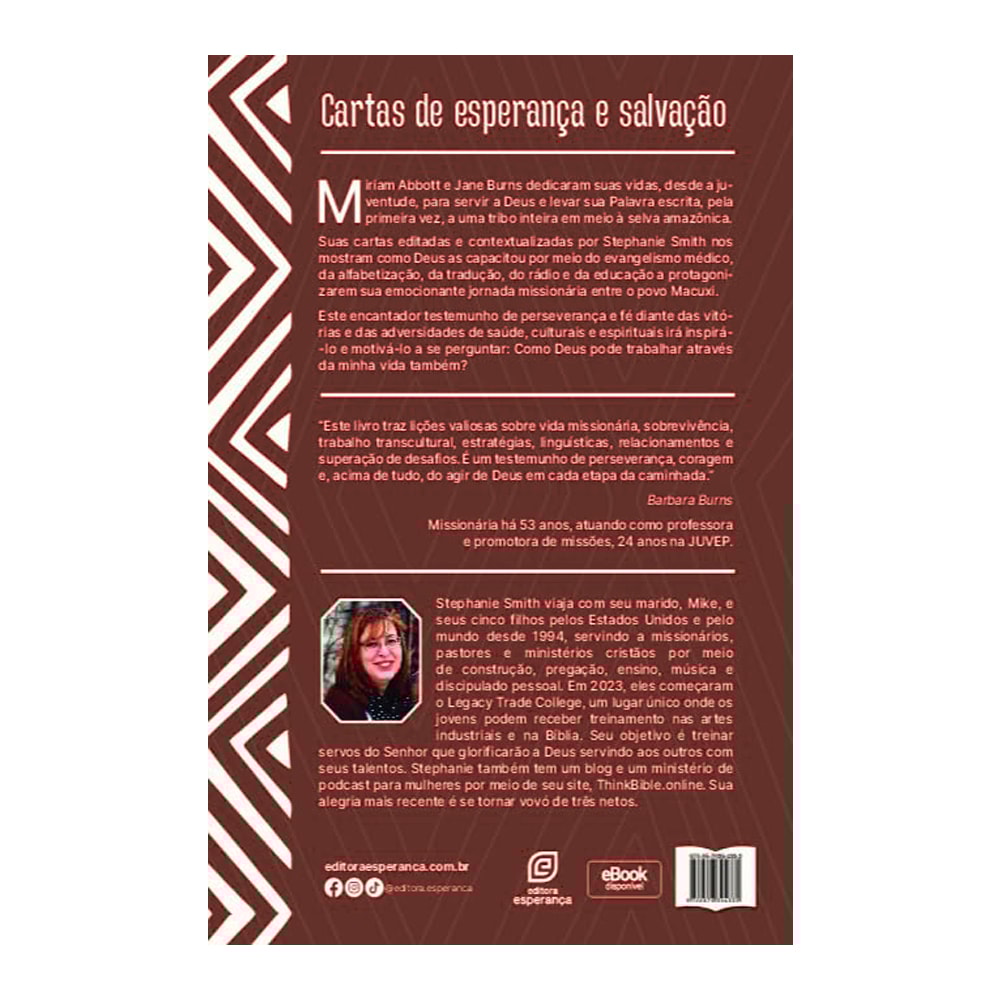 Miriam Abbott e Jane Burns dedicaram suas vidas a servir a Deus, levando Sua Palavra à tribo Macuxi na selva amazônica. Com o apoio de Stephanie Smith, suas cartas revelam como Deus as capacitou a evangelizar, alfabetizar, traduzir, usar o rádio e ensinar, enfrentando vitórias e desafios culturais, espirituais e de saúde. Este emocionante testemunho de fé e perseverança vai inspirá-lo a refletir: como Deus pode agir através da minha vida? "Este livro é um testemunho de coragem, superação e do agir de Deus em cada passo da jornada missionária." - Barbara Burns, missionária há 53 anos.