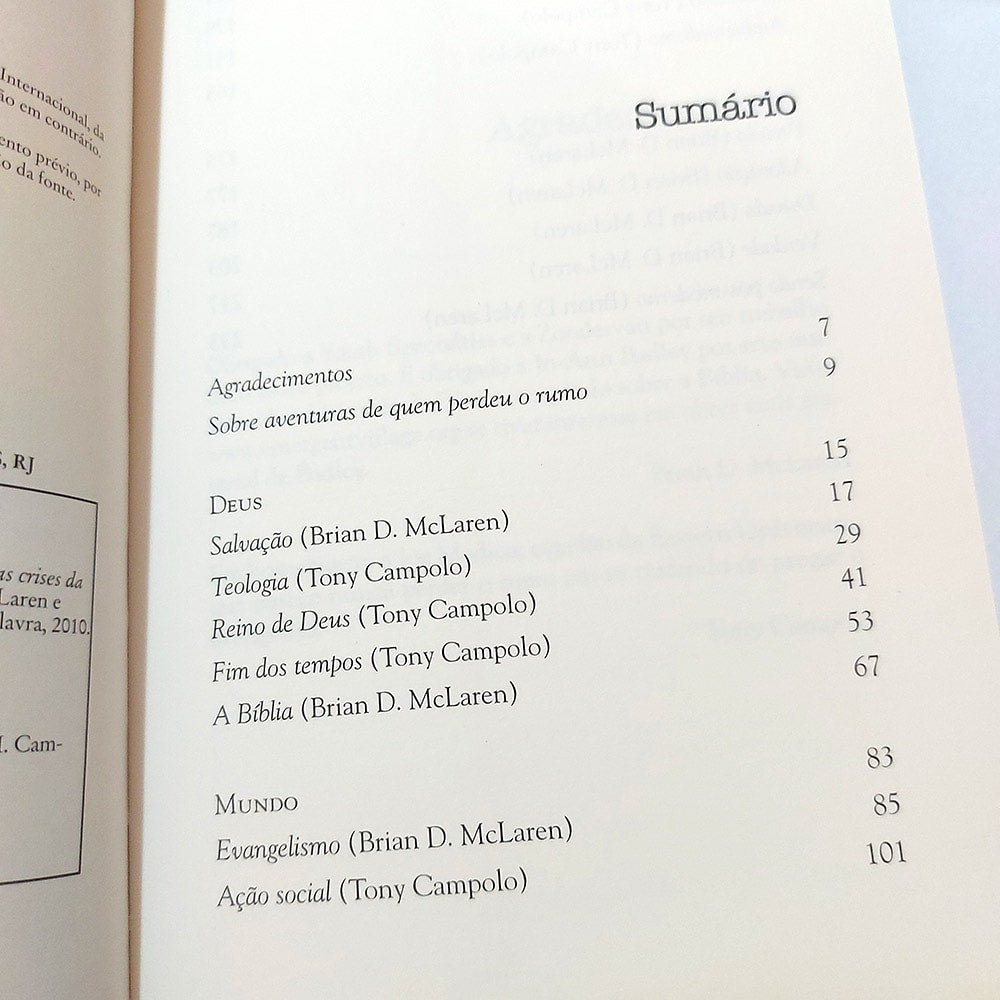 Em tom de conversa, Brian McLaren e Tony Campolo, na busca do que realmente significa ser cristão, expõem suas opiniões sobre o momento atual da Igreja e seus erros. A intenção é a de esfregar os olhos e tentar ver melhor onde a perspectiva tem sido nebulosa.