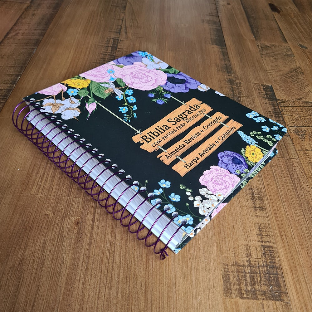 Bíblia com Pautas para Anotações | ARC | Harpa e Corinhos | Letra Normal | Capa Dura Espiral Jardim Preta