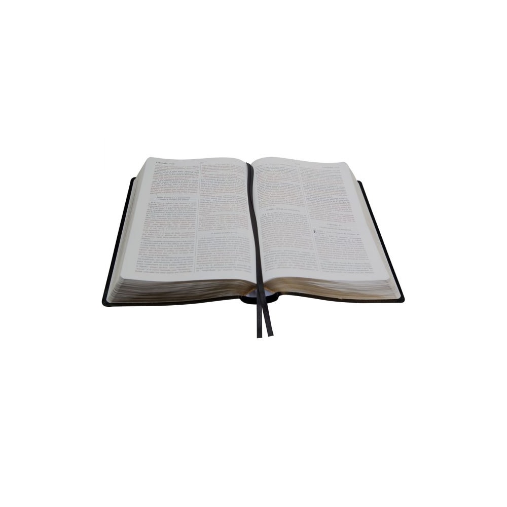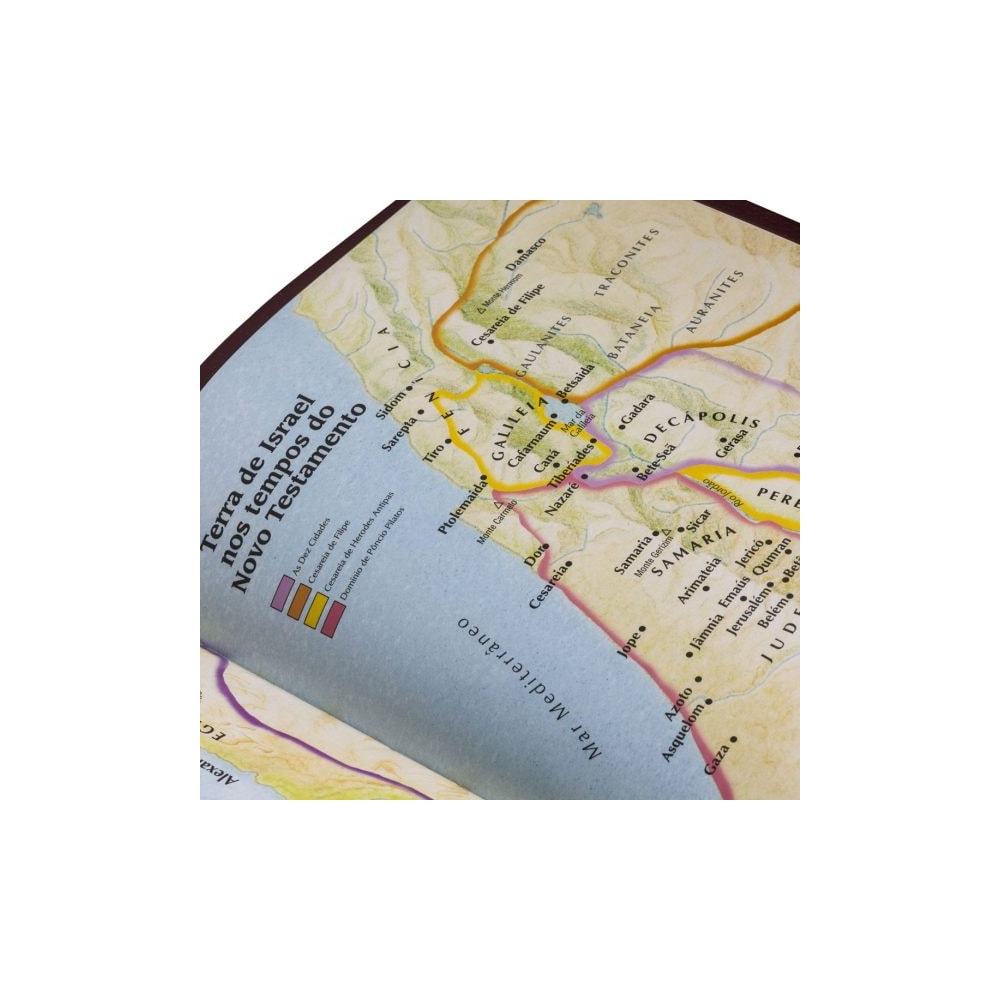 - Texto bíblico em negrito e notas do expositor em vermelho;