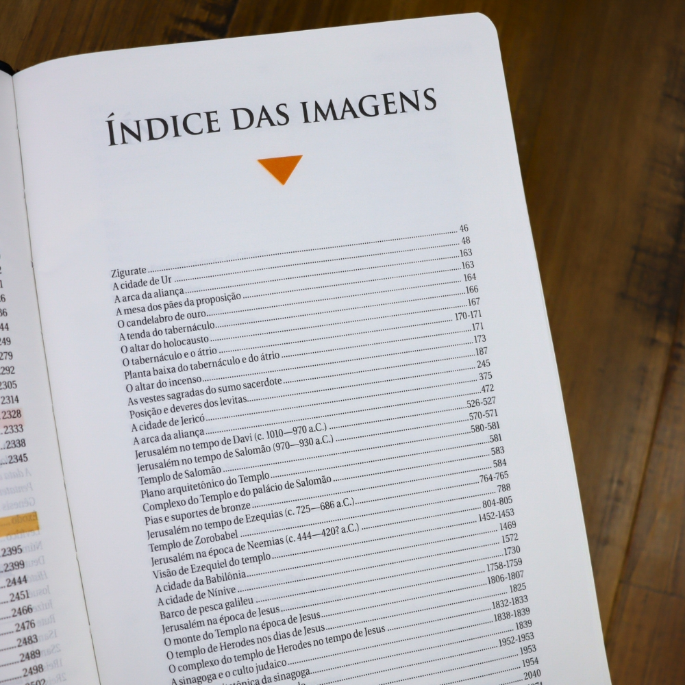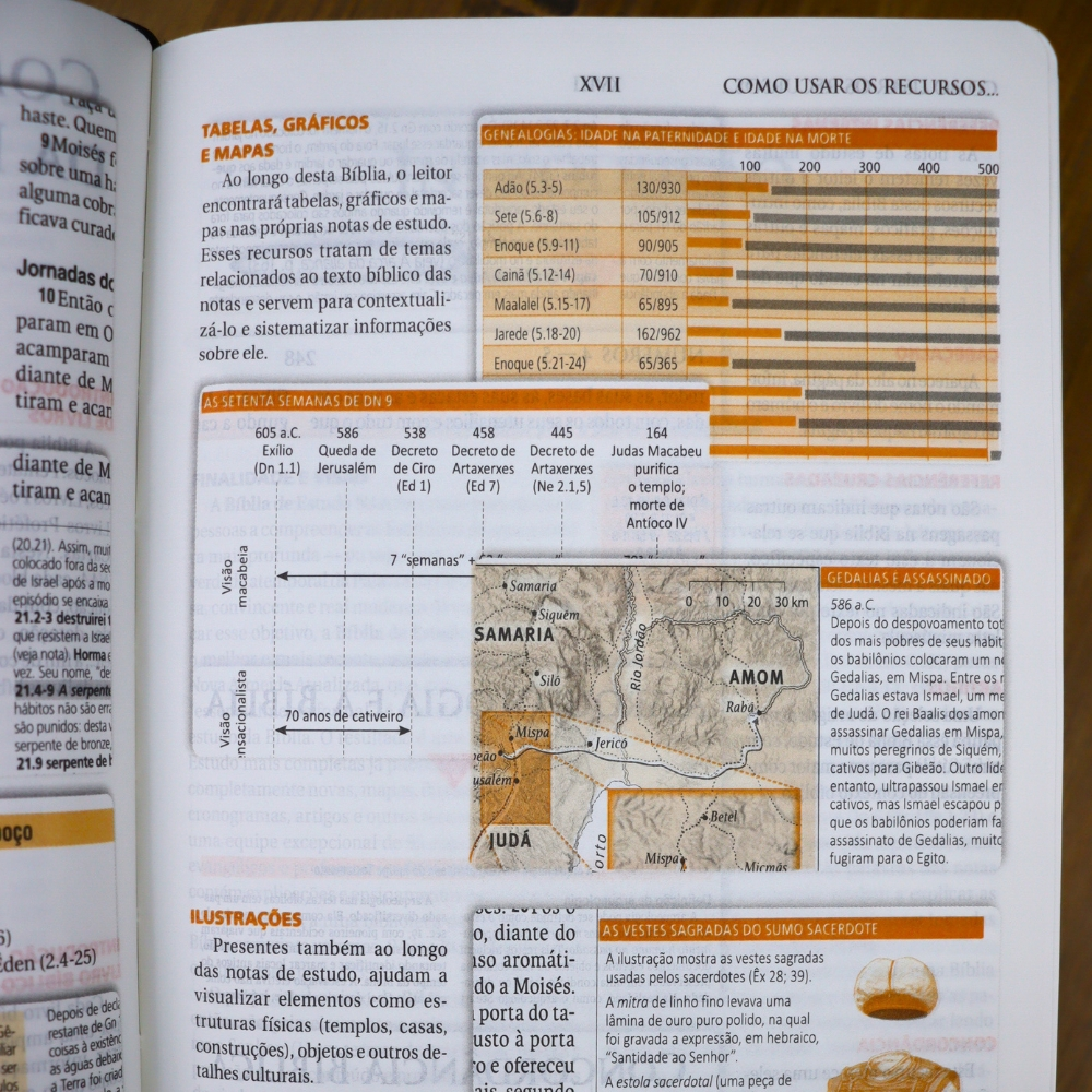 • Introdução aos livros e aos blocos de livros • Notas de estudo no rodapé: • 2.090 notas explicando os itens do esboço • 13.352 versículos com notas • 29.282 termos ou frases explicadas nas notas • 63 quadros temáticos • 211 mapas ao longo das introduções e notas • 221 tabelas • Artigos e recursos • Concordância • O plano divino da salvação • Doutrina bíblica: uma visão geral • Interpretando a Bíblia • Lendo a Bíblia • O cânone da Escritura • A confiabilidade dos manuscritos bíblicos • A arqueologia e a Bíblia • As línguas originais da Bíblia