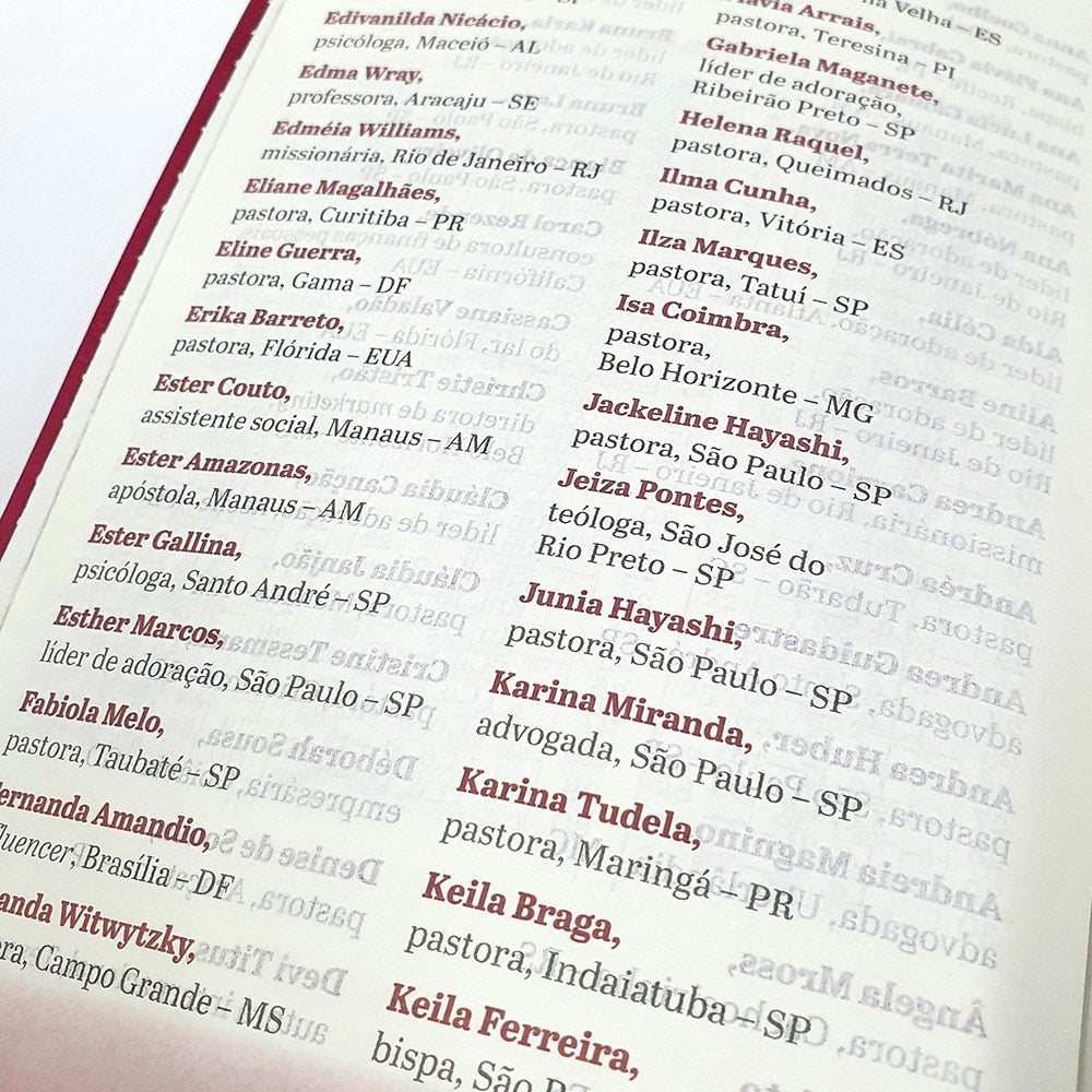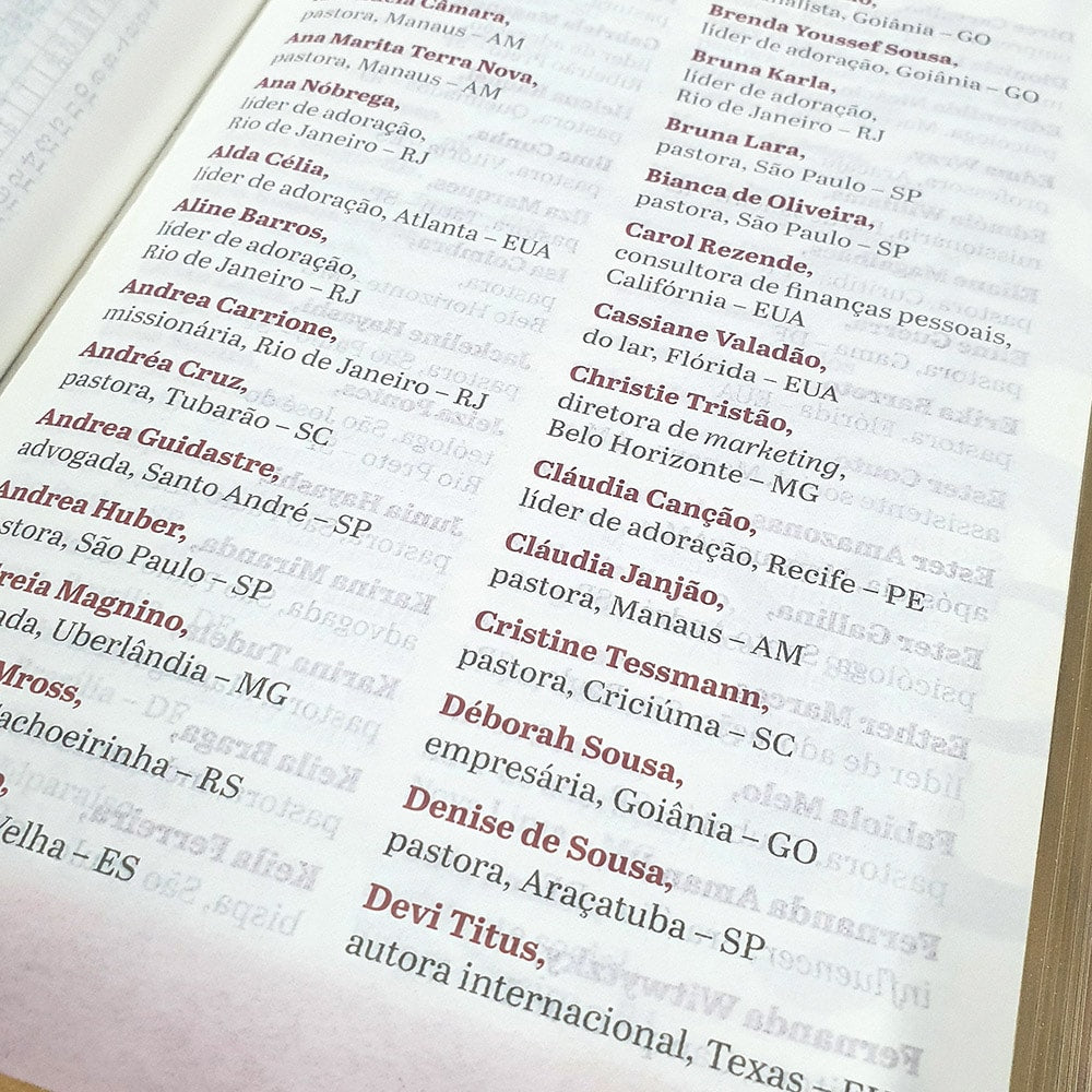 Ao longo da História, grandes Homens e mulheres se levantaram em obediência a Deus para cumprir os seus propósitos. Foi justamente isso que mudou realidades, nações, mentalidades, cidades e pessoas. Maria, Ester, Daniel, Ana, Paulo, Davi e Débora são alguns desses exemplos que, mesmo tendo vivido há muito anos, enfrentaram uma série de desafios similares aos que temos vivido. A bíblia de toda mulher além dessas Histórias fantasísticas, traz consigo devocionais escrito por: