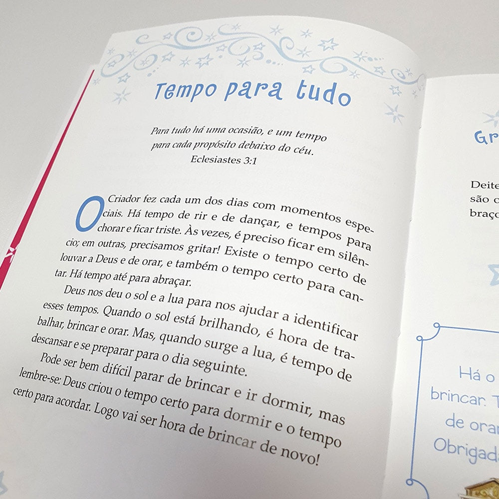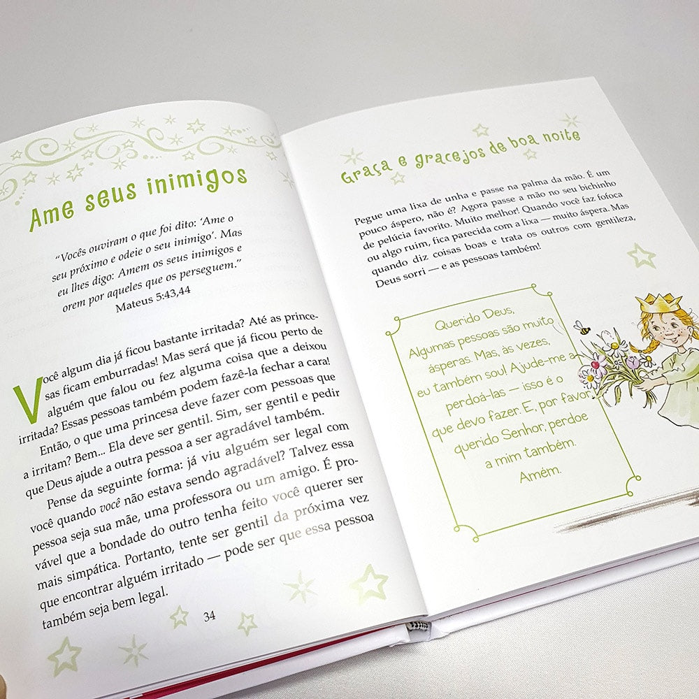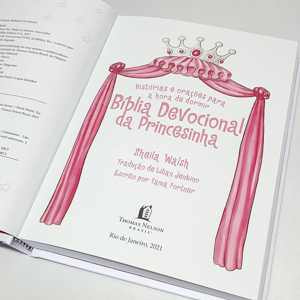 A princesinha vai dormir segura e confortável no amor de Deus. A hora de dormir é um momento especial entre pais e filhas, e a Bíblia devocional da princesinha vai ajudar a encerrar o dia do melhor jeito possível. São mais de 100 devocionais, orações e atividades para tornar o coração de cada menina mais aberto para a verdade e o amor de Deus. Os devocionais ressaltam as maravilhas do Senhor em palavras que a princesinha consegue entender e a seção Graça e gracejos de boa noite oferece maneiras práticas de tornar a Palavra de Deus real na vida dela, enquanto a oração suave ajuda a embalar tudo, como um cobertor aconchegante. Não importa se o dia foi longo ou cansativo, não há maneira melhor de encerrá-lo junto de Deus do que lendo este lindo livro perfeito para todas as meninas.| Título: | Bíblia Devocional da Princesinha |