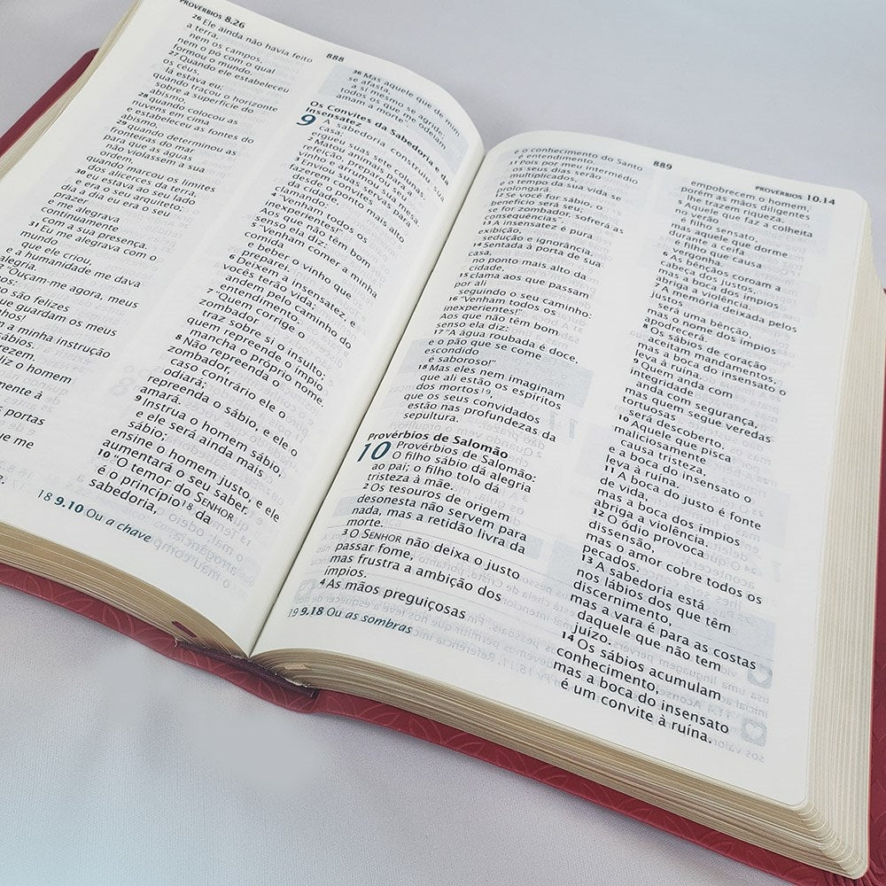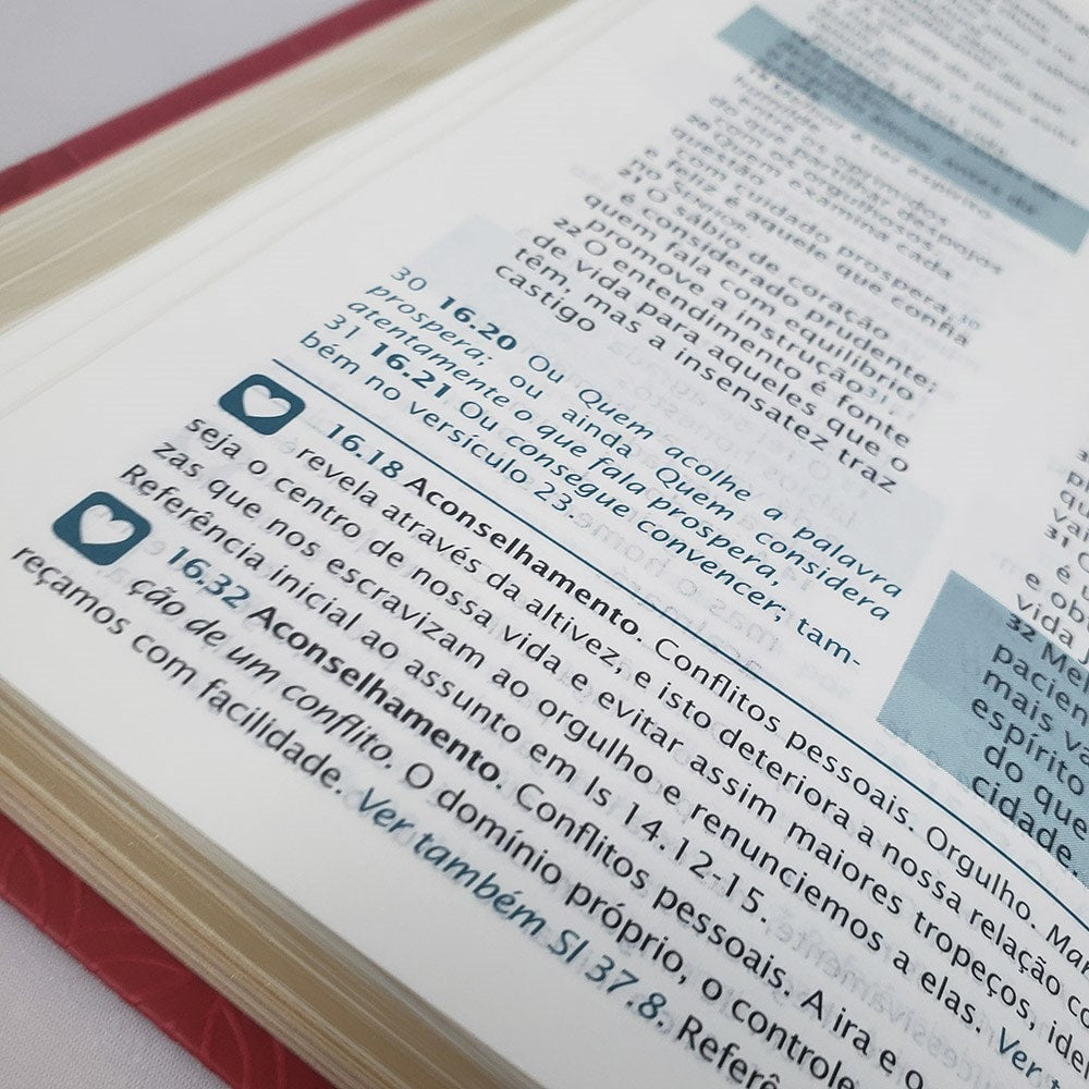 Ao longo de todo o texto bíblico, os versículos-chave estão sombreados para serem identificados com maior facilidade e, além disso, incluem notas esclarecedoras no pé da página que explicam a ideia principal de maneira simples.
