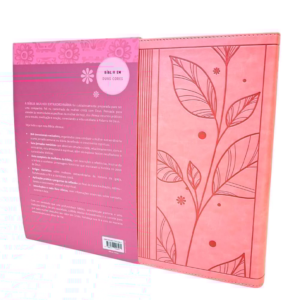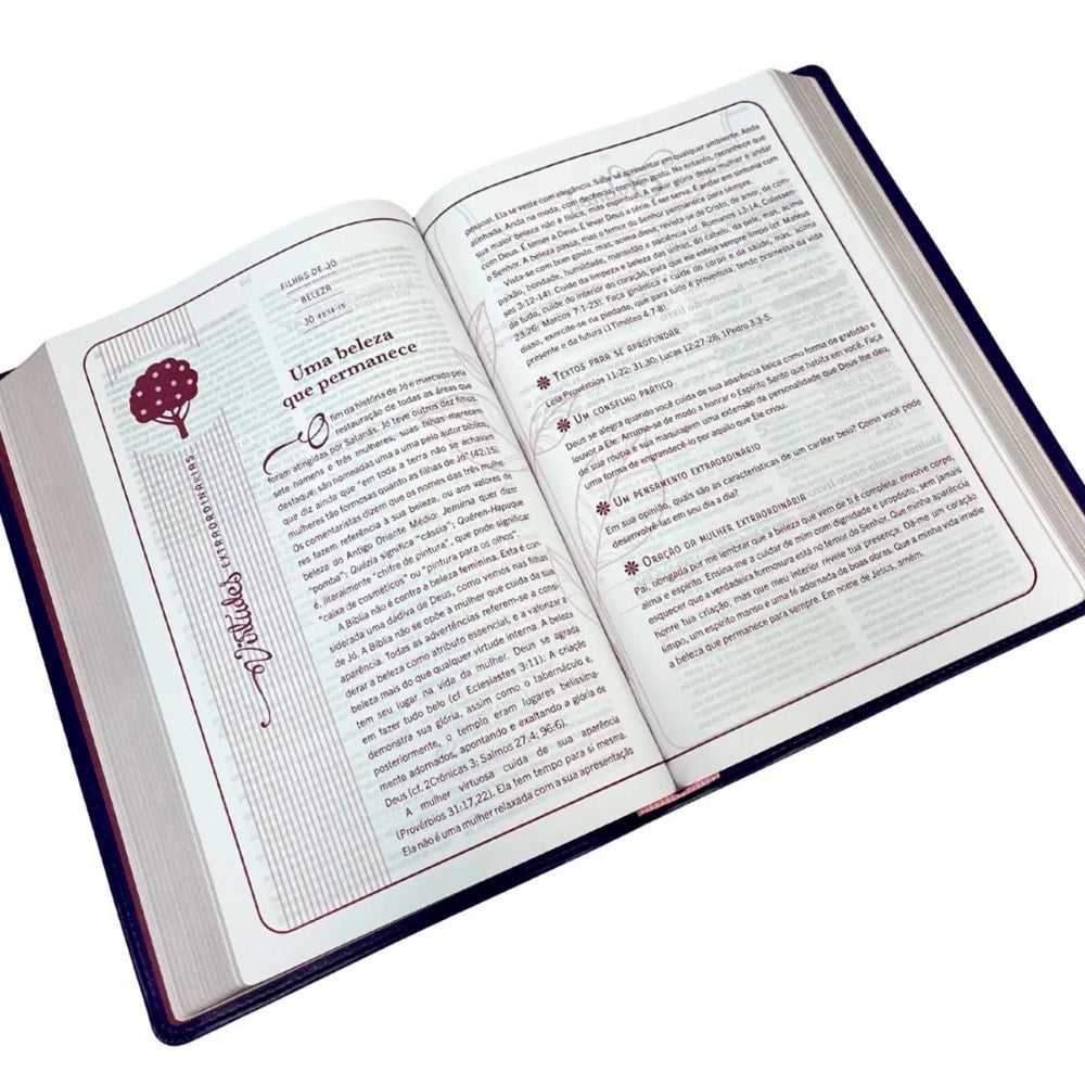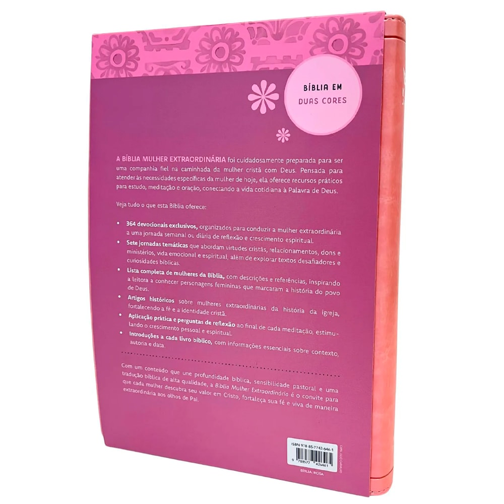Elaborada com dedicação para apoiar a caminhada espiritual da mulher cristã, a Bíblia Mulher Extraordinária foi desenvolvida para atender às necessidades específicas da mulher contemporânea. Com recursos práticos que facilitam o estudo bíblico, a meditação e o momento de oração, esta edição ajuda a conectar o cotidiano à Palavra de Deus. Ideal para quem busca profundidade e aplicação prática da fé no dia a dia.