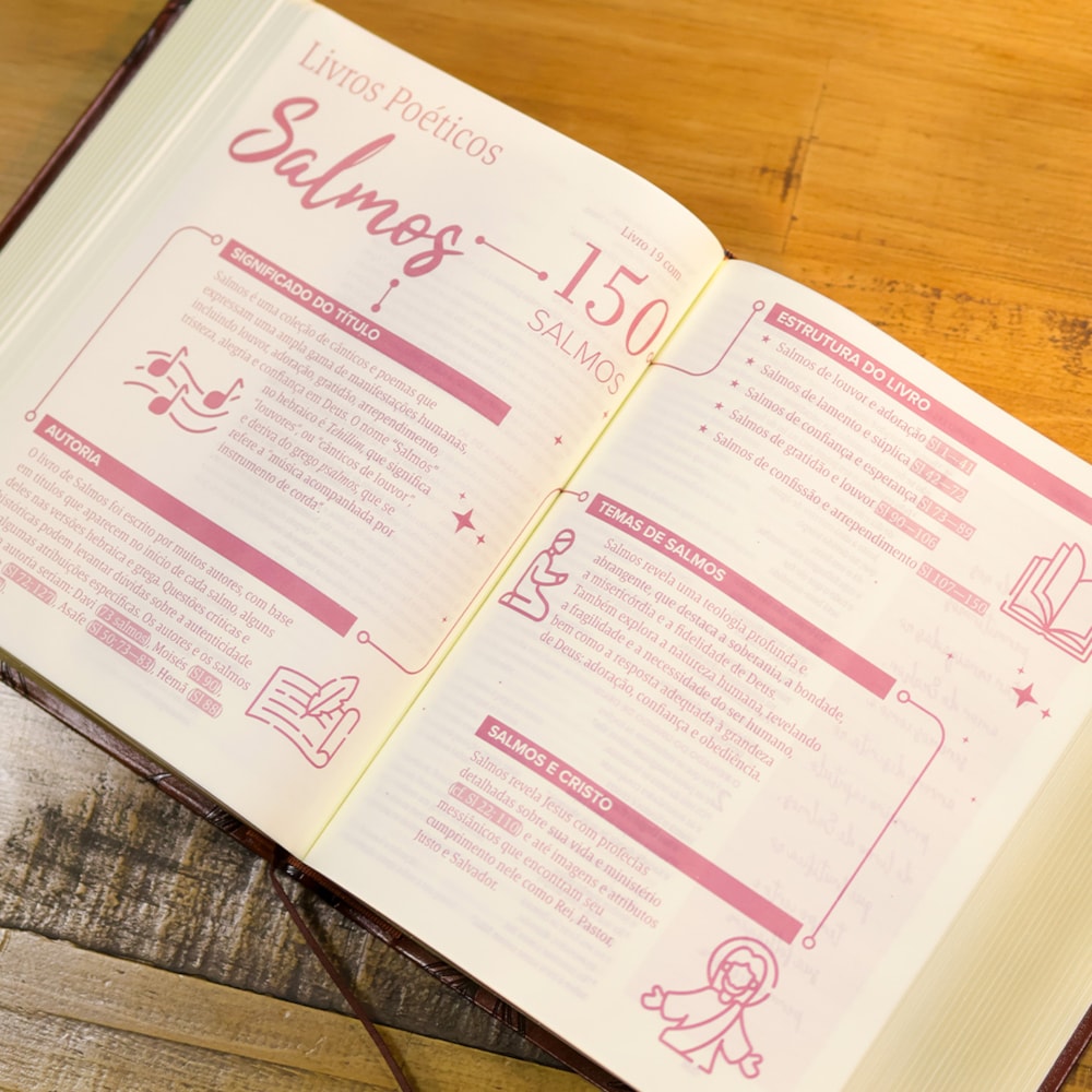 Elaborada com carinho pela pastora Viviane Martinello, esta edição foi pensada para acompanhar você em sua caminhada com Deus. Com espaços para anotações, mapas mentais, introduções aos livros, frases inspiradoras e fonte confortável, ela é perfeita para levar consigo todos os dias.