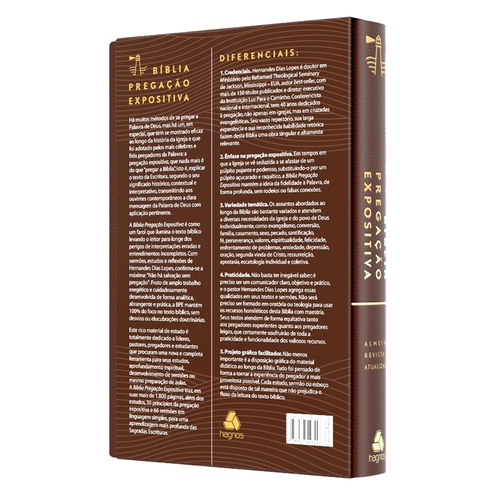 Este rico material de estudo vivo e eficaz, com texto Almeida Revista e Atualizado (ARA), é totalmente dedicado a líderes, pastores, pregadores e estudantes que procuram uma nova e completa ferramenta para seus estudos, aprofundamento espiritual, desenvolvimento dos sermões ou mesmo preparação de aulas. A Bíblia Pregação Expositiva traz, em suas mais de 1800 páginas, além das notas e estudos, 30 artigos inéditos e 66 sermões em linguagem simples, para uma aprendizagem mais profunda das Sagradas Escrituras.