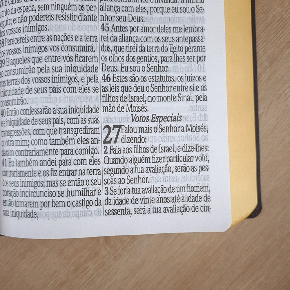 Bíblia Sagrada, com a linguagem na versão ARC (Revista Corrigida) de João Ferreira de Almeida. Sendo a versão mais utilizada pelos evangélicos do Brasil. Com sua fidelidade traduzida dos textos originais pelo missionário português João Ferreira de Almeida, esta obra tem como destaque sua linguagem elegante e culta. A bíblia também possui harpa avivada e corinhos.
