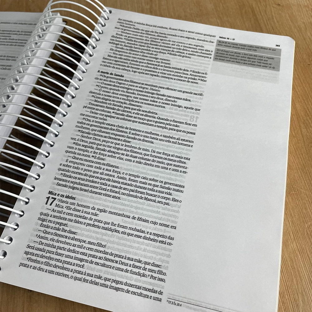 Na Bíblia Sagrada Jornada, há muitos espaços para que você escreva, anote, desenhe, cole, pinte e personalize sua Bíblia. Ao ler a Palavra de Deus, o leitor poderá interagir, registrando o que pensa ou sente, anotando explicações ou pregações, fazendo ilustrações, sublinhando ou destacando o que mais chamou a atenção no texto sagrado. Esta Bíblia é ideal para tudo isso e muito mais.