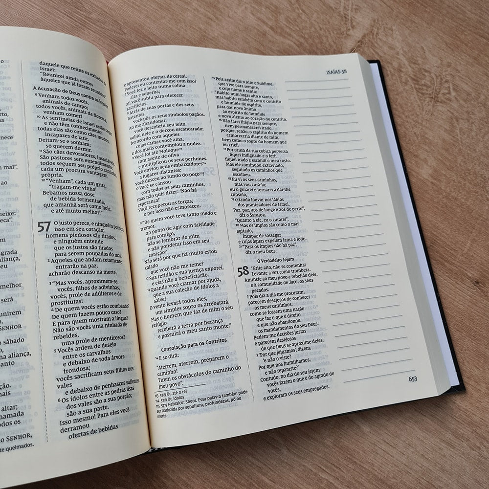 Quantas vezes estamos na igreja e ouvimos algo tão tocante que queremos registrar, mas não podemos porque não temos onde anotar? Você até gostaria de escrever na própria Bíblia, para que aquela informação complementasse seus estudos bíblicos, mas ela não tem espaço. Esta Bíblia chegou para resolver esse problema.