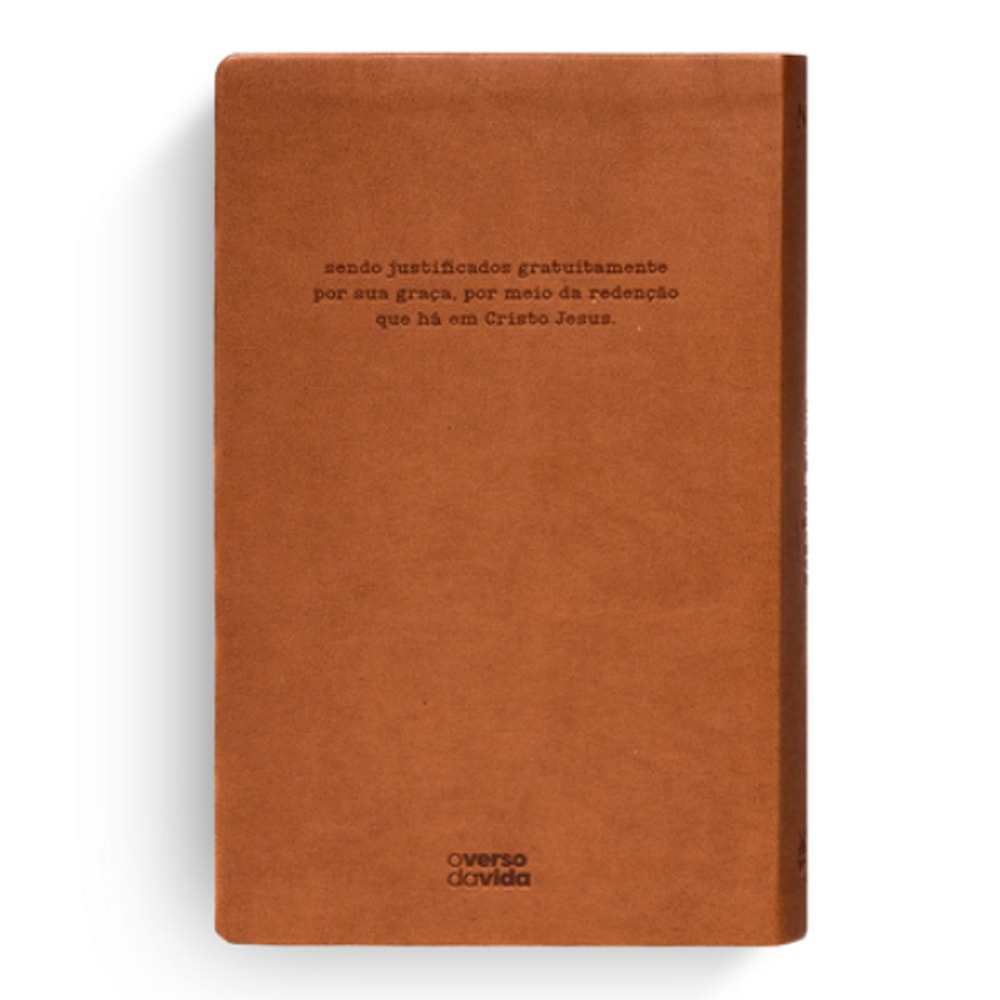 Na contracapa, o versículo de Romanos 3:24 está gravado com precisão: "Sendo justificados gratuitamente por sua graça, por meio da redenção que há em Cristo Jesus."