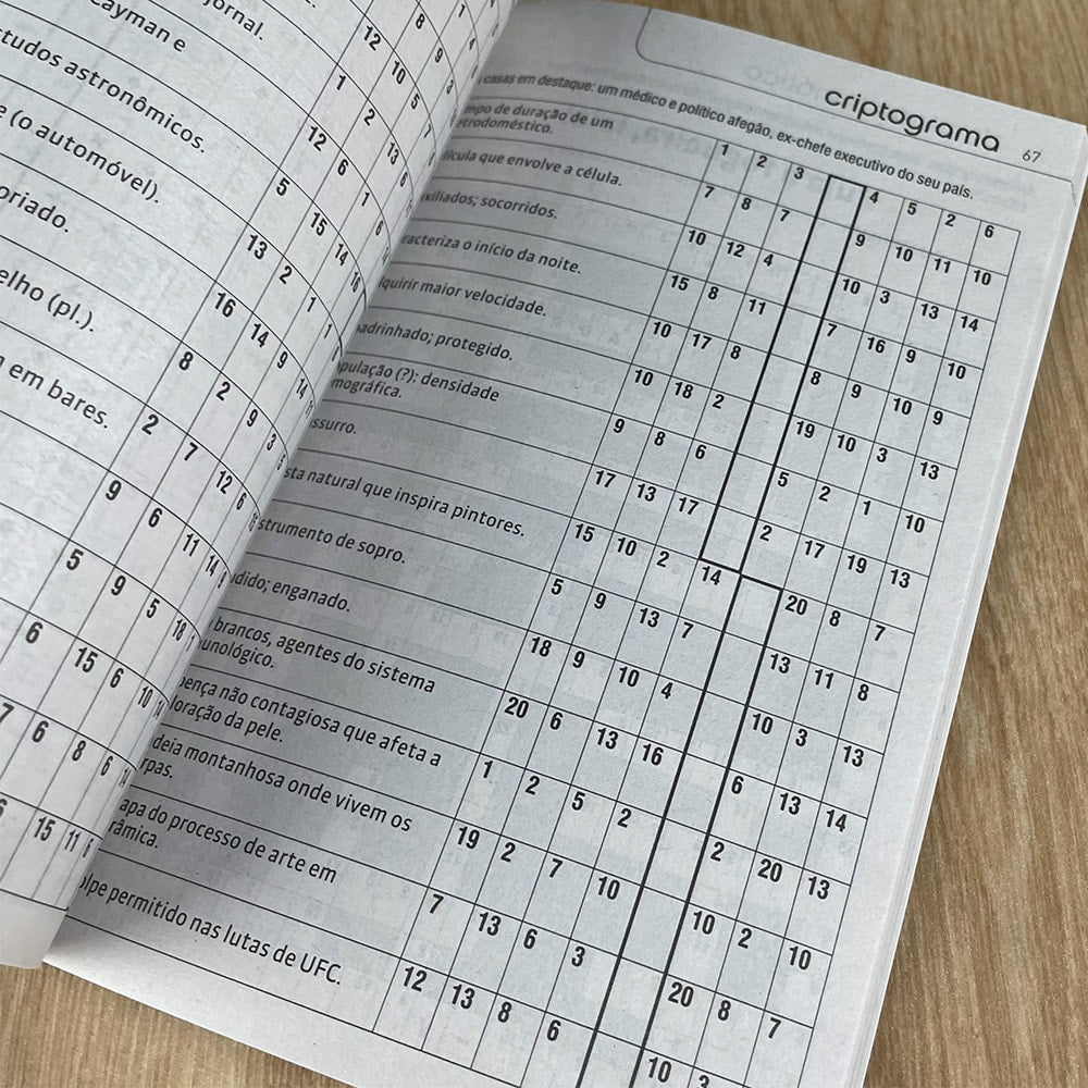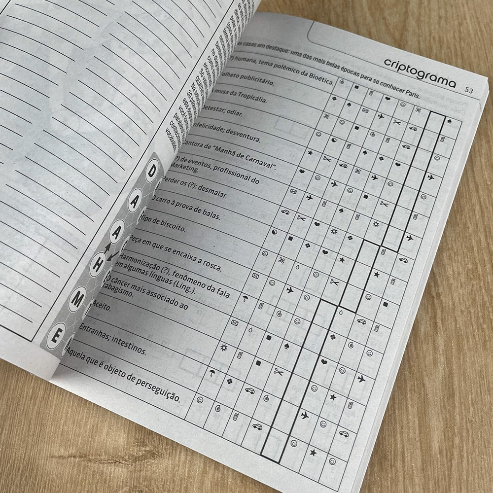 Descubra as associações que são a chave para a resposta correta à pergunta feita no enunciado. A cada símbolo ou número, uma letra diferente. Muitas horas de diversão cheia de desafios em 144 páginas de Criptogramas e outros passatempos.