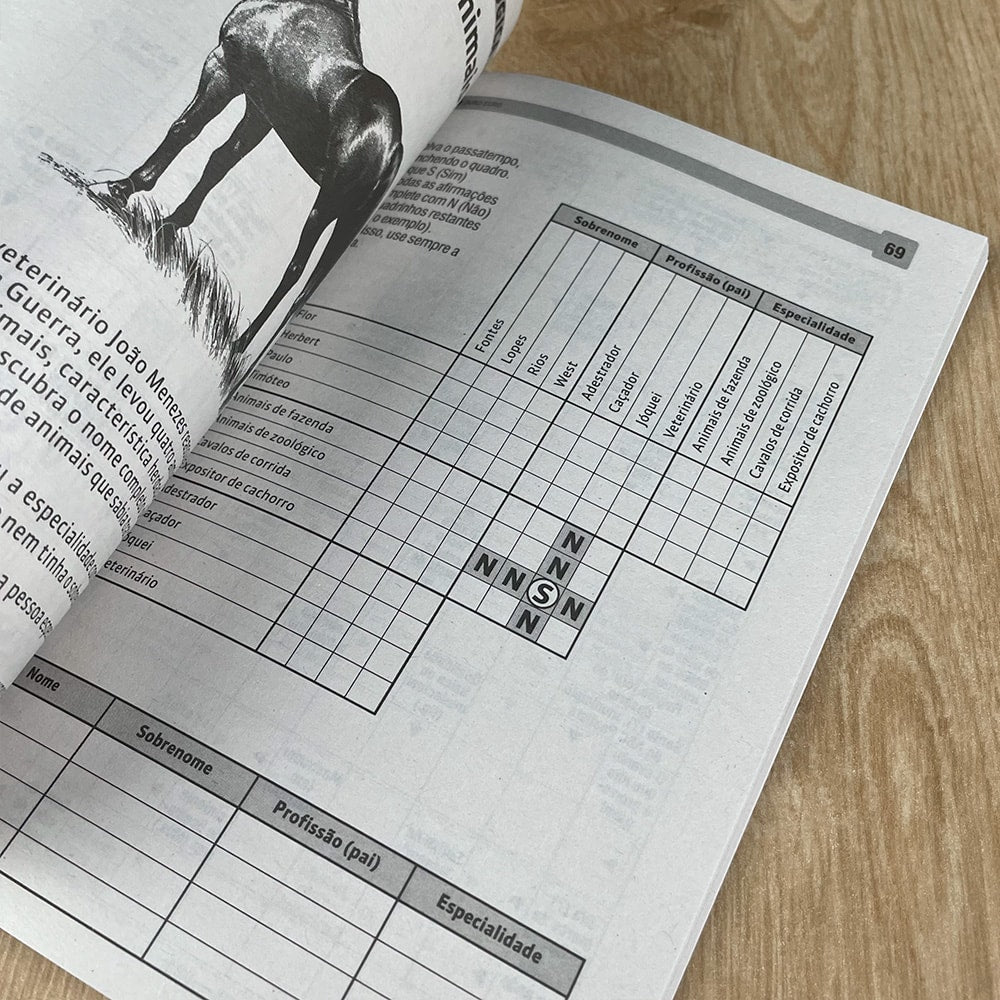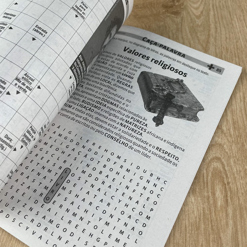 São 100 páginas para atitudes saudáveis como: caça-palavra, diretas, sudoku, caça-resposta, criptocruzada, criptograma, cruzadox, dominox, duplex, jogo dos erros, numerox, torto e problemas de lógica.