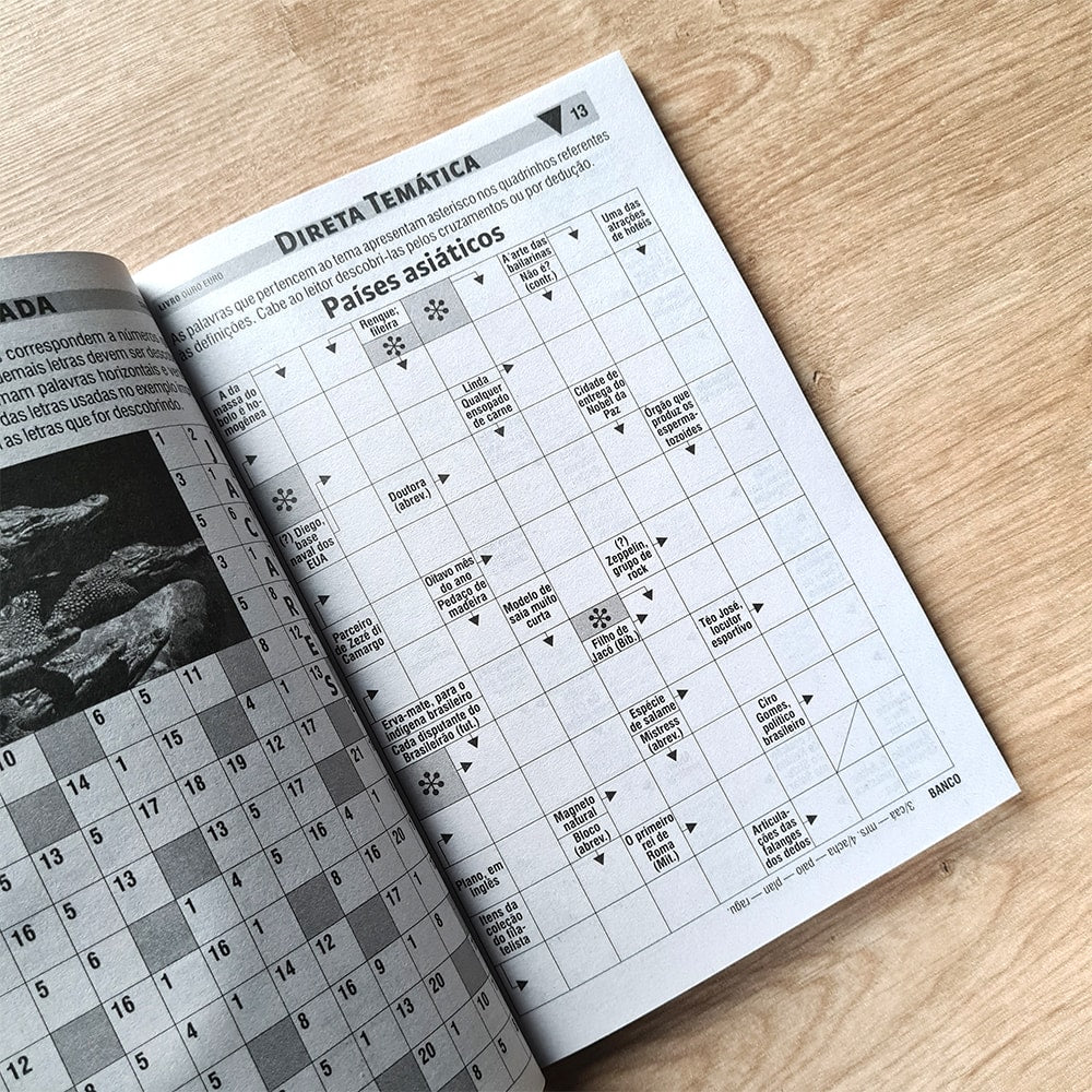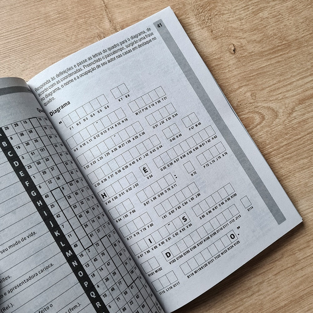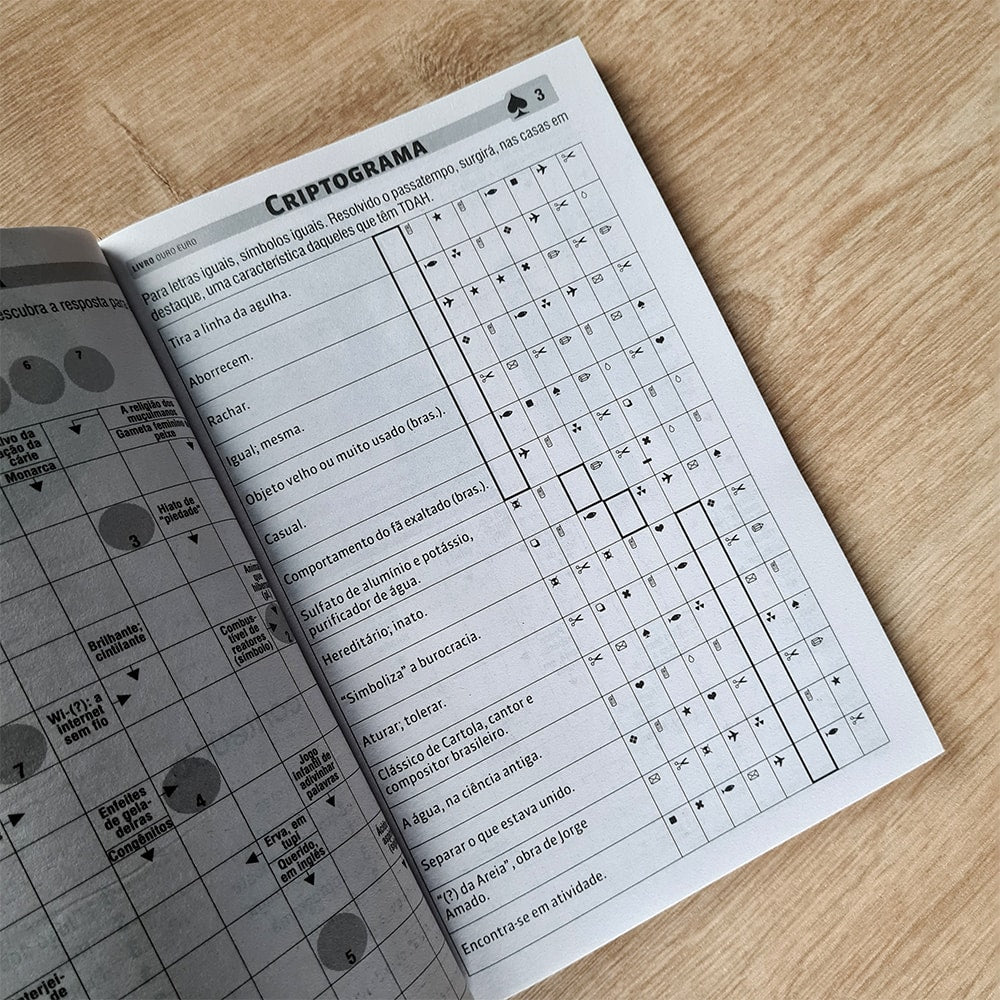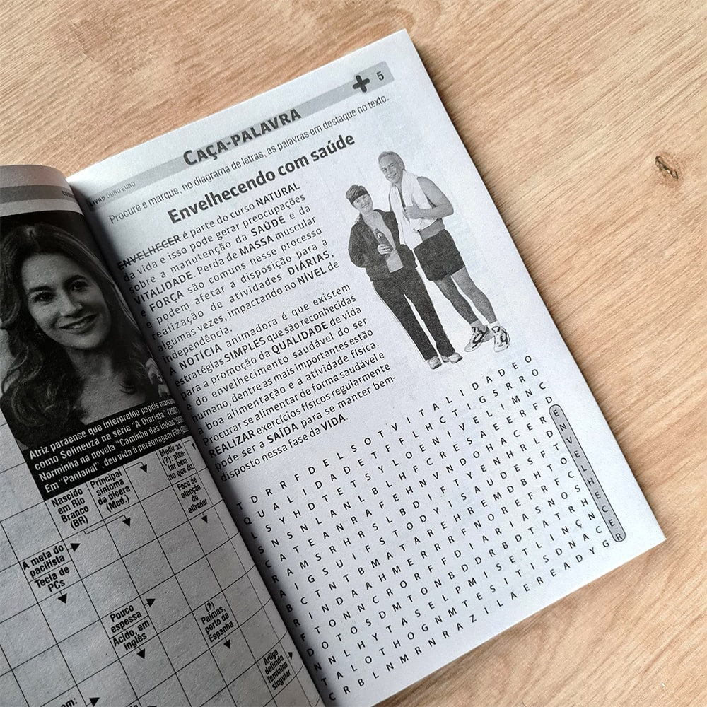 São 144 páginas para atitudes saudáveis como: caça-palavra, diretas, sudoku, caça-resposta, criptocruzada, criptograma, cruzadox, dominox, duplex, jogo dos erros, numerox, torto e problemas de lógica.