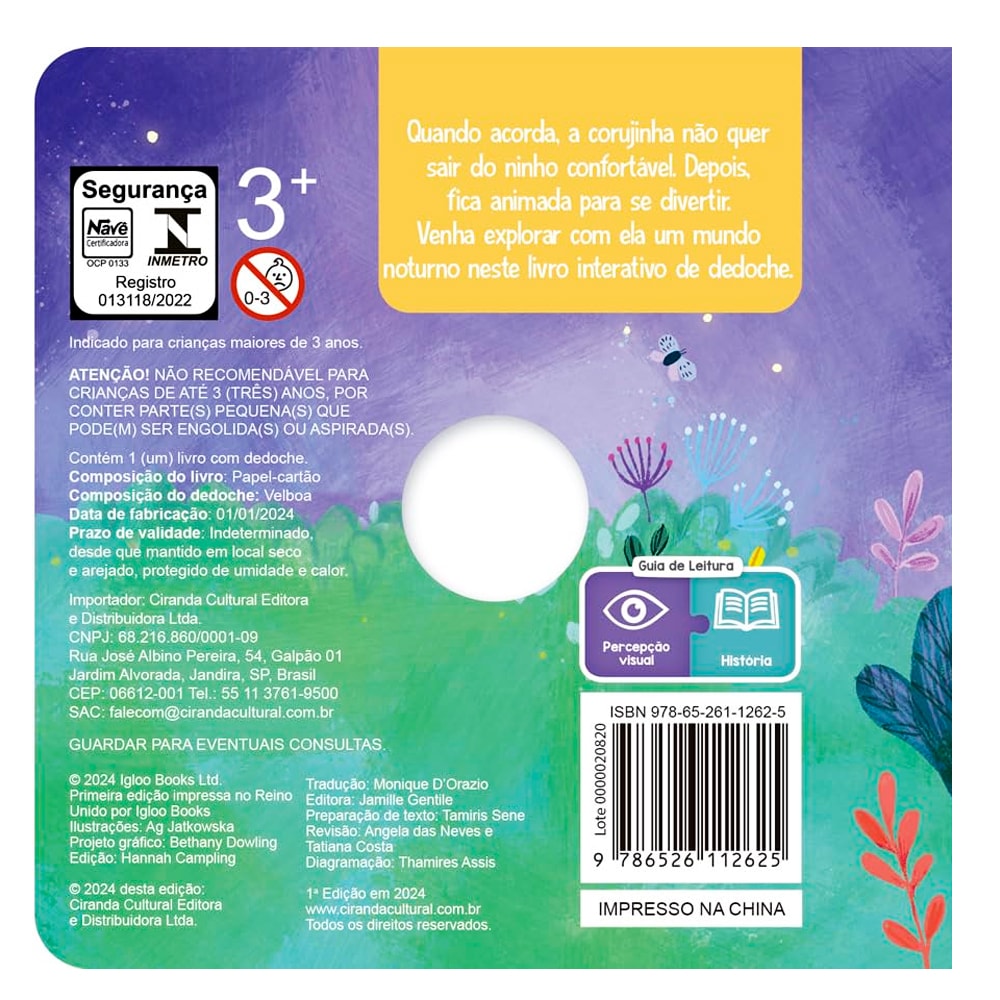 Junte-se a ela neste livro interativo com dedoche, onde você poderá guiar a corujinha por paisagens encantadoras, conhecer novos amigos e viver momentos mágicos sob o céu estrelado.