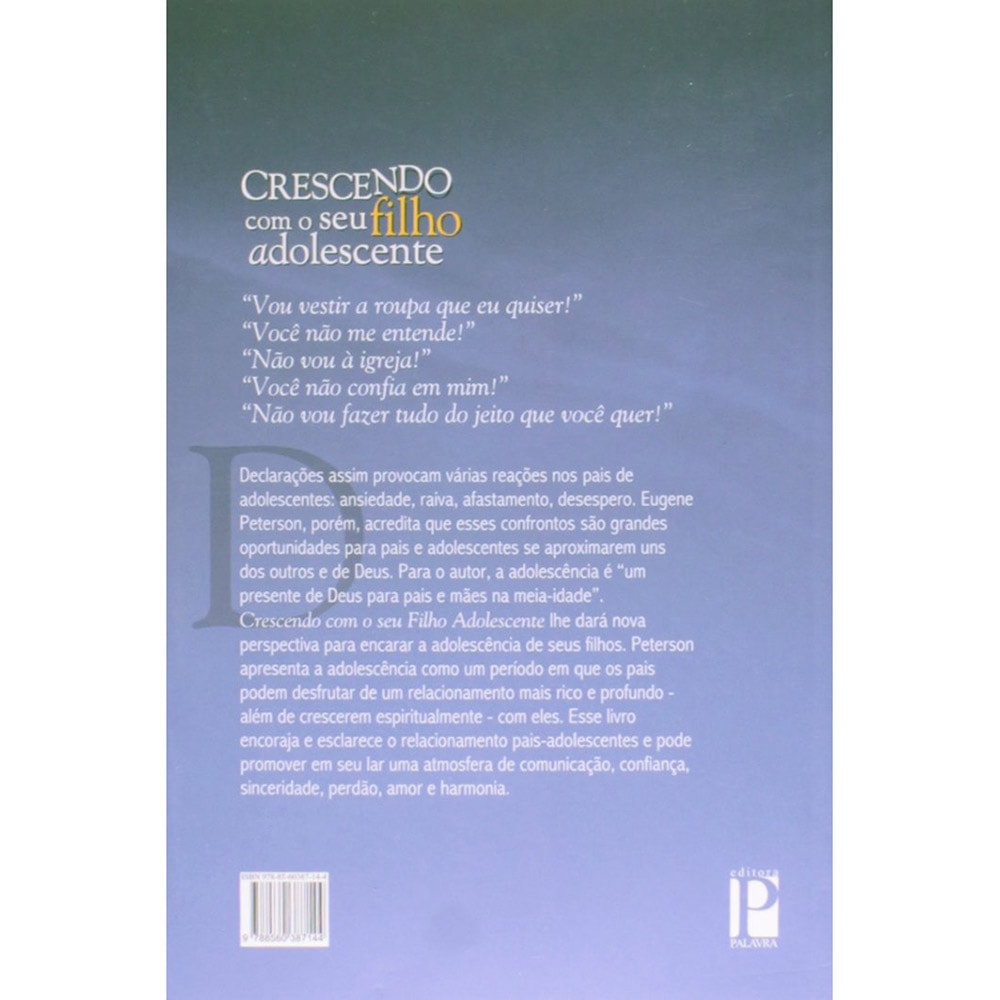 "Vou vestir a roupa que eu quiser!" "Você não me entende!" "Não vou à igreja!" "Você não confia em mim!" "Não vou fazer tudo do jeito que você quer!" Declarações assim provocam várias reações nos pais de adolescentes: ansiedade, raiva, afastamento, desespero. Eugene Peterson, porém, acredita que esses confrontos são grandes oportunidades para pais e adolescentes se aproximarem uns dos outros e de Deus. Crescendo com seu Filho Adolescente traz uma nova perspectiva para encarar a adolescência de seus filhos. Apresenta a adolescência como um período onde os pais podem desfrutar de relacionamento mais rico e profundo - além de crescerem espiritualmente - com eles.