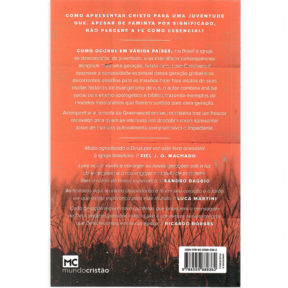 No Brasil a igreja desconectou da juventude, e as dramáticas consequências atingiram toda uma geração. Neste livro, Luke Greenwood mostra como é possível apresentar Cristo para uma juventude que, apesar de faminta por significado, não percebe a fé como essencial. Na obra, o missionário, músico e diretor europeu da Steiger International descreve a necessidade espiritual das gerações emergentes e os decorrentes desafios para as missões na atualidade.
