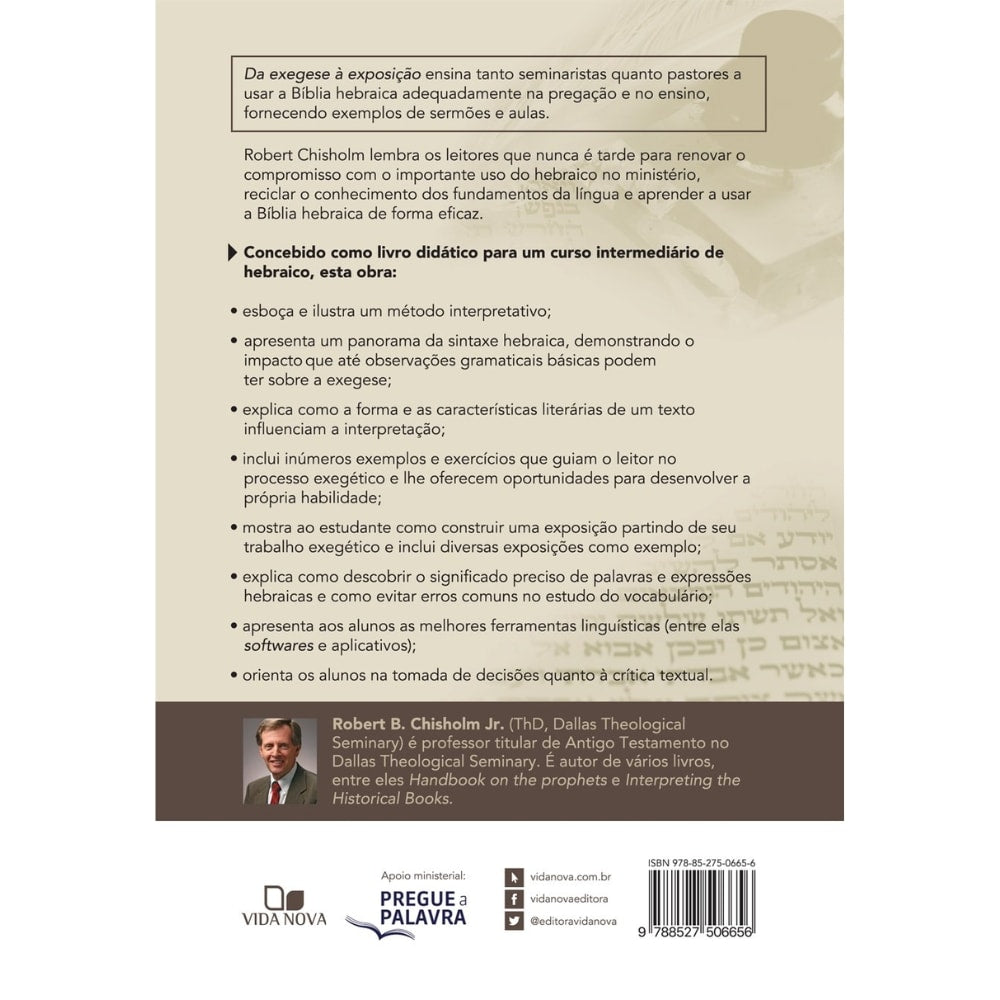 Da exegese à exposição ensina tanto seminaristas quanto pastores a usar a Bíblia hebraica adequadamente na pregação e no ensino, fornecendo exemplos de sermões e aulas.