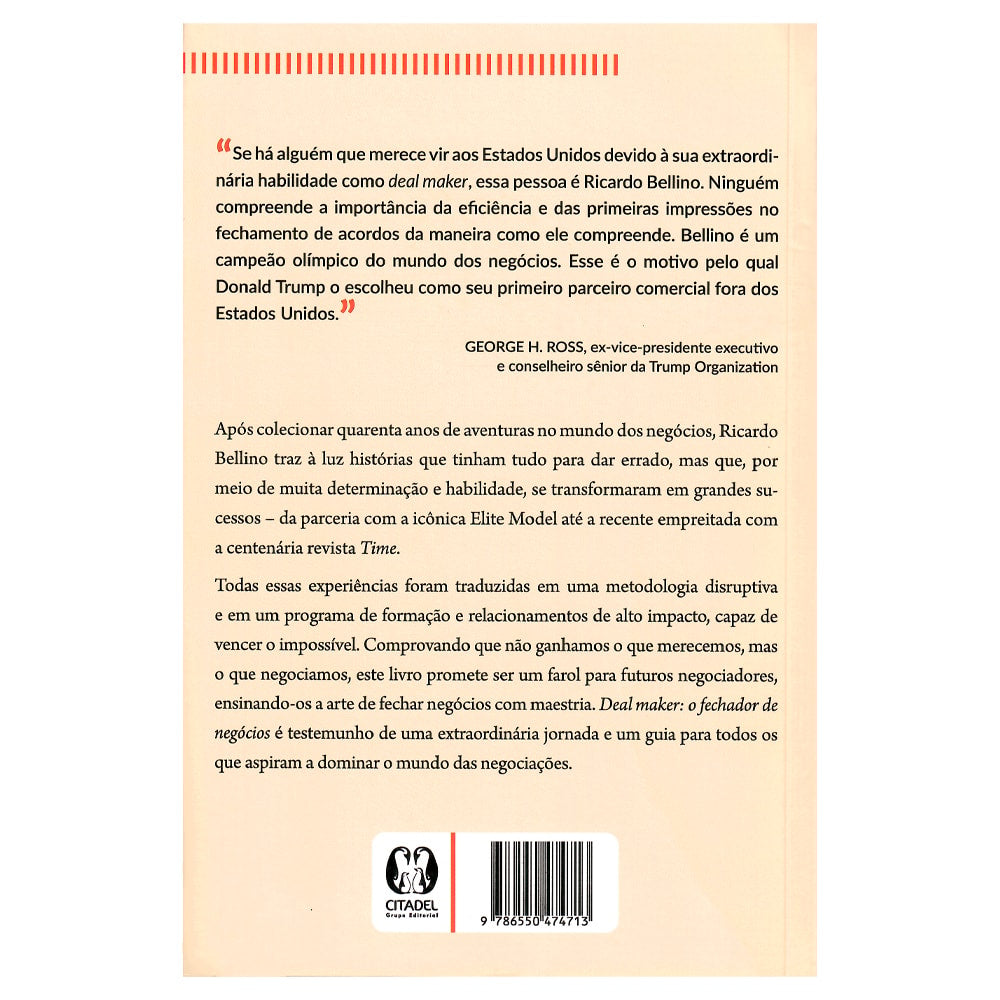 Após 40 anos de aventuras no mundo dos negócios, Ricardo Bellino compartilha histórias de como superou desafios e transformou obstáculos em grandes sucessos, desde sua parceria com a Elite Model até sua recente colaboração com a revista Time. Com uma metodologia disruptiva e um programa de formação de alto impacto, Bellino ensina a arte de fechar negócios com maestria. Este livro é um guia para futuros negociadores, mostrando que não ganhamos o que merecemos, mas o que negociamos. Deal Maker: O Fechador de Negócios é um testemunho de sua extraordinária jornada.