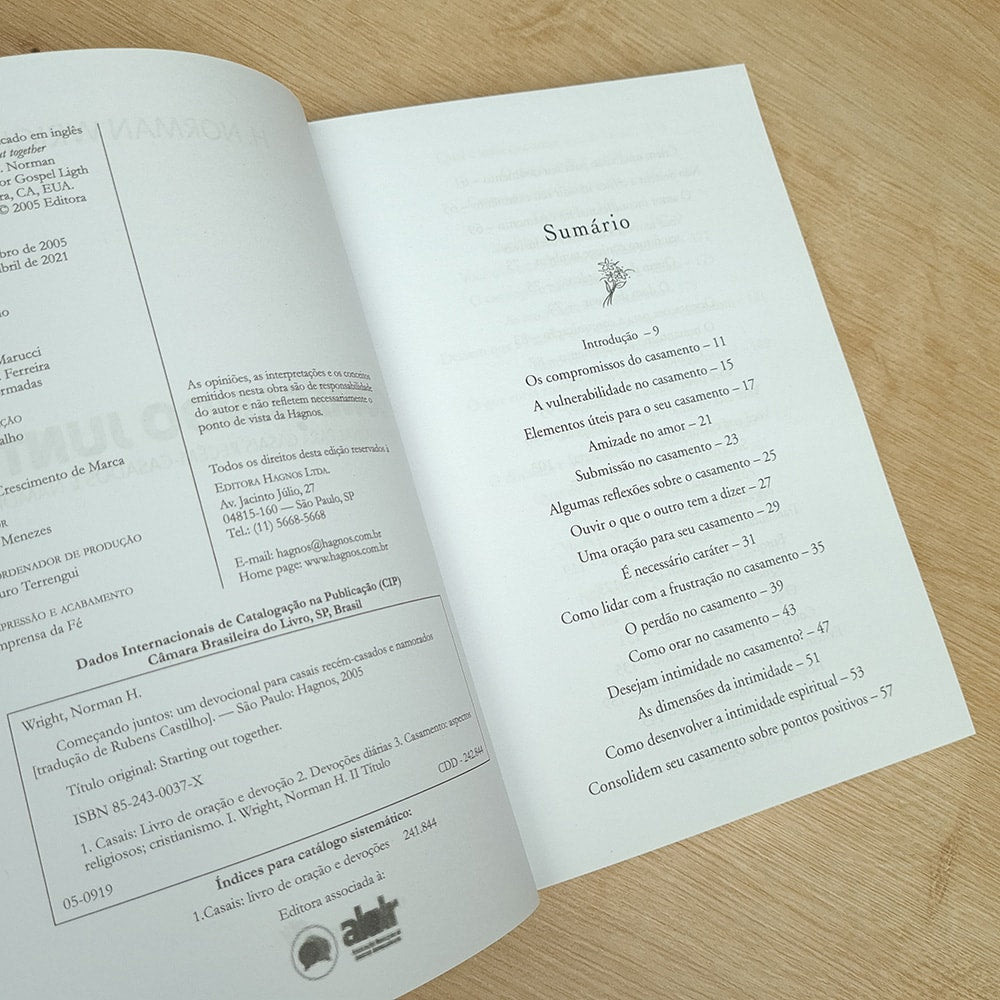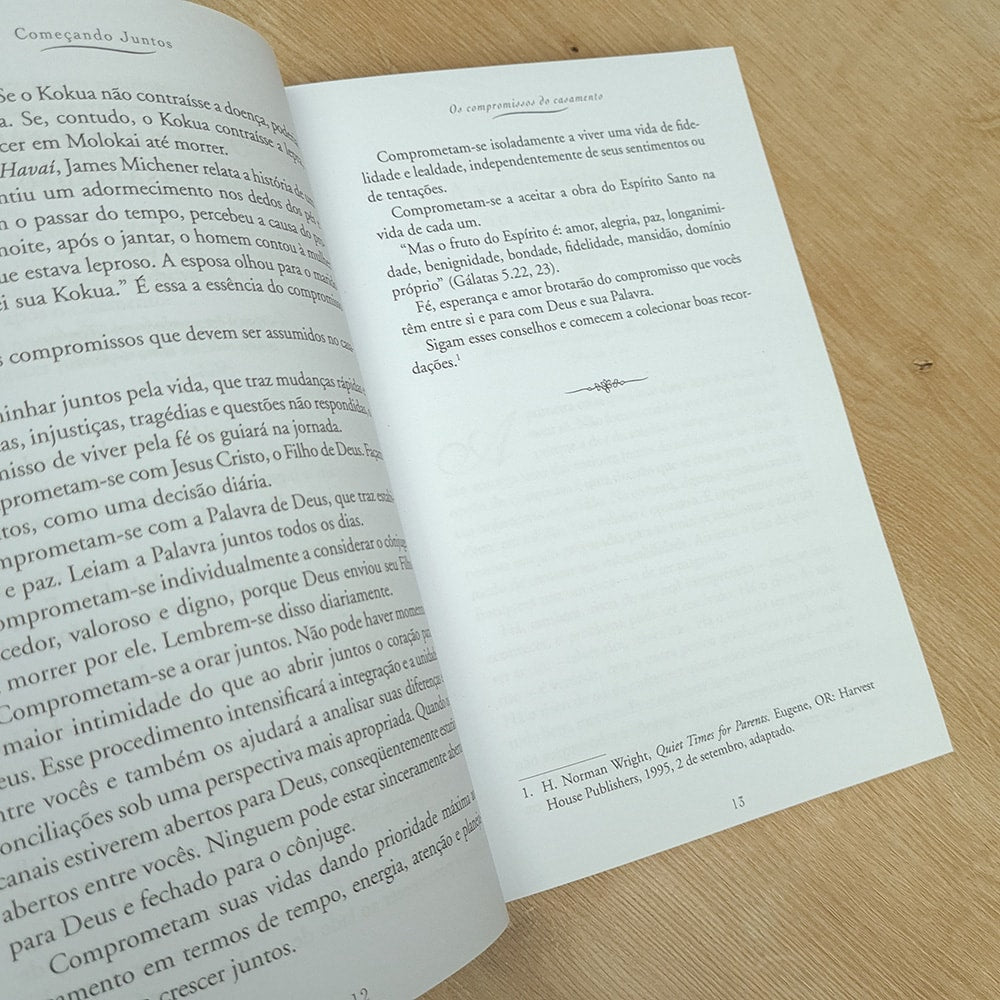A leitura Começando juntos é uma excelente forma de namorados, noivos e recém-casados manterem a sintonia com Deus, orando e estudando juntos a sua Palavra. Dr. H. Norman Wright é terapeuta matrimonial, familiar e infantil licenciado. Ele clinicou em seu consultório particular por mais de 30 anos, foi diretor do Departamento de Pós-Graduação em Casamento, Família e Aconselhamento Infantil na Biola University (Califórnia, EUA), bem como professor associado de Psicologia. Atualmente, trabalha como professor pesquisador de Educação Cristã na Talbot School of Theology da Biola University. Autor prolífico, o Dr. Wright já escreveu mais de 90 livros.