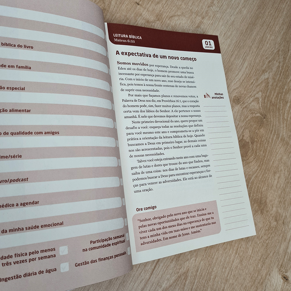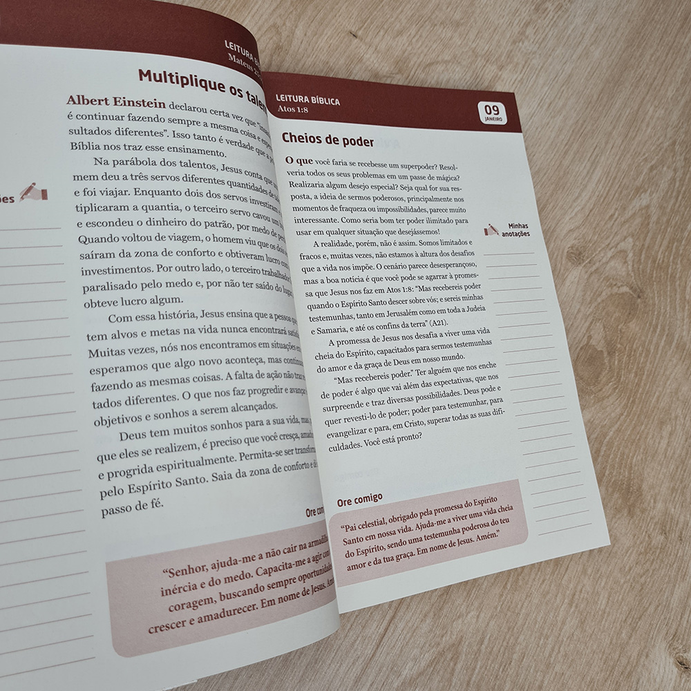 Em "Fé e Esperança para Cada Dia", você também encontrará uma página de planejamento todos os meses, para poder propor a si mesmo metas e acompanhá-las. Além disso, espalhadas por toda a obra, há pequenas interações que o ajudarão a refletir sobre pontos específicos de sua jornada, bem como um texto especial para os anos bissextos.