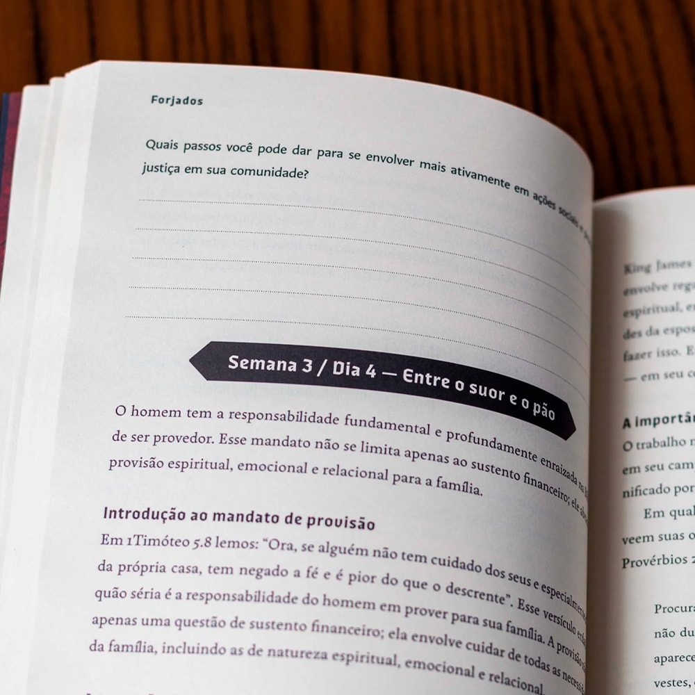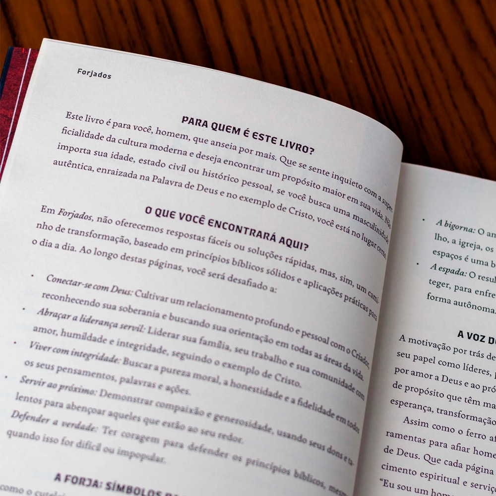 Forjados é um devocional cristão de 8 semanas, com 6 estudos semanais, projetado especificamente para a formação e o discipulado de homens. A obra utiliza a poderosa metáfora da forja — o processo de transformar metal bruto em uma lâmina forte e útil — para guiar uma jornada de transformação do caráter.