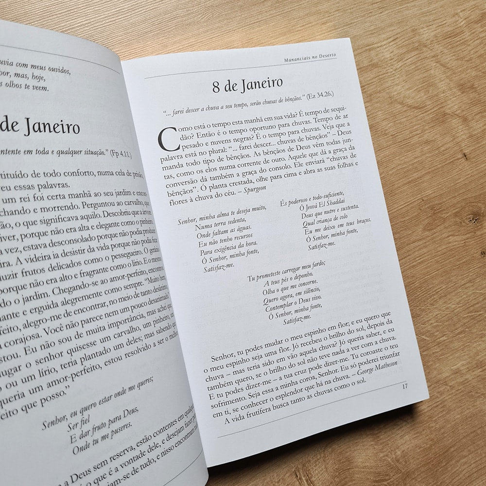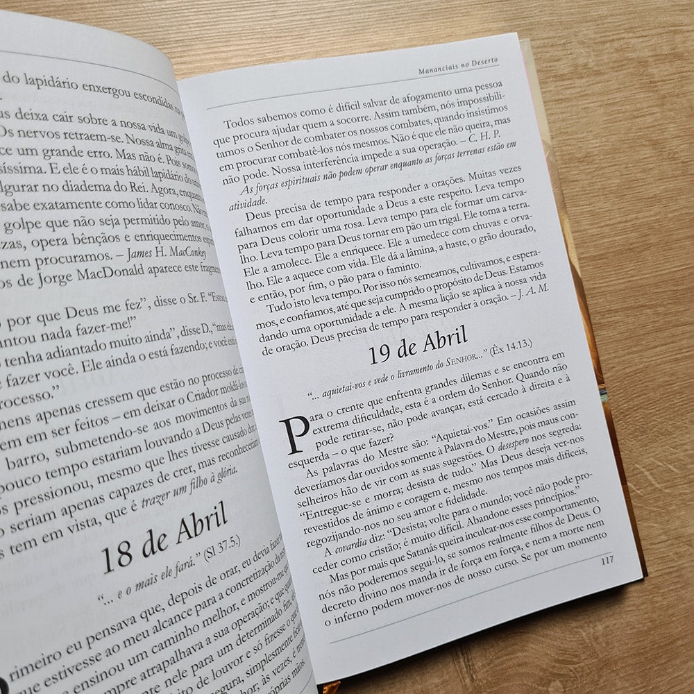Nesta parceria em coedição, Editora Betânia e Publicações Pão Diário oferecem uma edição especial luxo, em uma quantidade limitada, para o público brasileiro, em geral e para os apaixonados leitores de Mananciais no Deserto. A parceria traz duas propostas de apresentação de capa: uma em capa dura e outra capa em couro luxo. Ambas têm o mesmo miolo com 366 devocionais (um para cada dia do ano). São mensagens que oferecem água pura, cristalina, refrescante, em doses diárias para saciar sua sede e fortalecer seu coração. As mensagens trazem alento, esperança, orientação prática e respostas que nos ajudam a ver o amor de Deus presente mesmo nas circunstâncias difíceis. São meditações breves, sempre acompanhadas de uma passagem bíblica, para cada dia do ano.