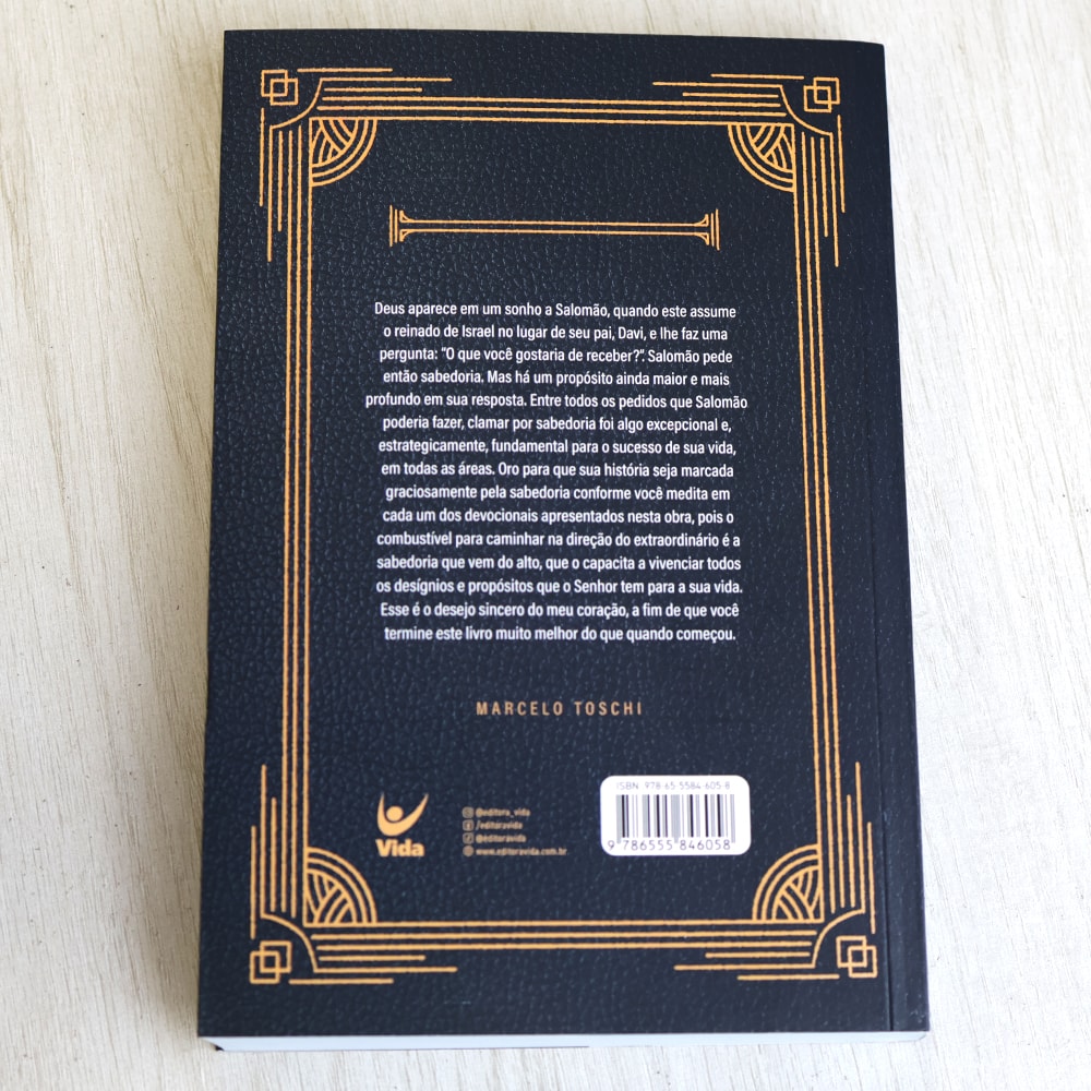 Em um sonho, Deus pergunta a Salomão o que ele gostaria de receber ao assumir o reinado de Israel. Salomão pede sabedoria, um pedido extraordinário e fundamental para o sucesso em todas as áreas de sua vida. Este livro é um convite para que, assim como Salomão, você busque a sabedoria divina em cada devocional. A sabedoria que vem de Deus é o combustível para viver de forma extraordinária, alinhado aos Seus propósitos. Meu desejo é que, ao terminar esta obra, você esteja transformado e mais preparado para os planos do Senhor em sua vida.