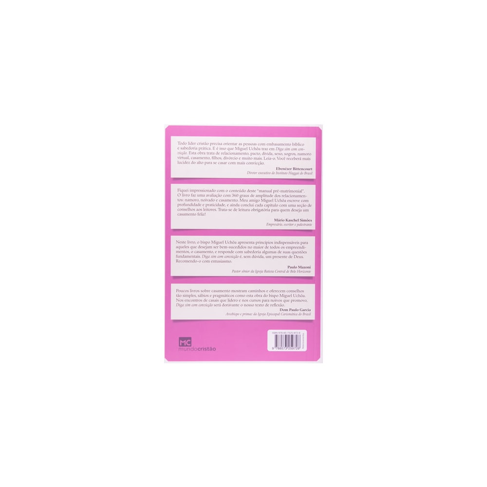 As três dimensões do amor feminino Seja uma mulher de Deus Abençoe sua família Entenda as promessas do Senhor Construa os fundamentos da fé Persevere em meio às tribulações Caminhe para o futuro Siga a direção de Deus Desfrute as dádivas ao longo do caminho Receba inspiração divina Viva a vida plenaTítulo: | Diga Sim com Convicção |