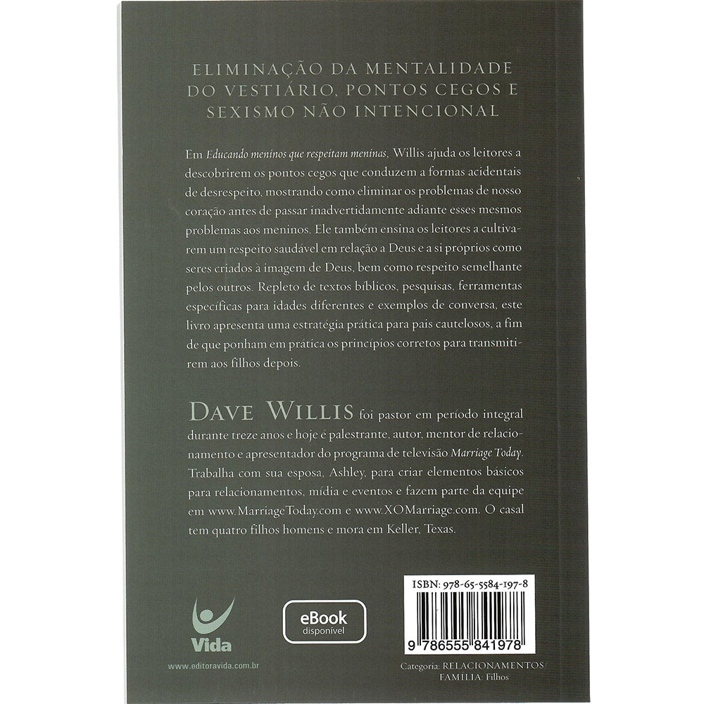 Em Educando meninos que respeitam meninas, Willis ajuda os leitores a descobrirem os pontos cegos que conduzem a formas acidentais de desrespeito, mostrando como eliminar os problemas de nosso coração antes de passar inadvertidamente adiante esses mesmos problemas aos meninos. Ele também ensina os leitores a cultivarem um respeito saudável em relação a Deus e a si próprios como seres criados à imagem de Deus, bem como respeito semelhante pelos outros. Repleto de textos bíblicos, pesquisas, ferramentas específicas para idades diferentes e exemplos de conversa, este livro apresenta uma estratégia prática para pais cautelosos, a fim de que ponham em prática os princípios corretos para transmitirem aos filhos depois.