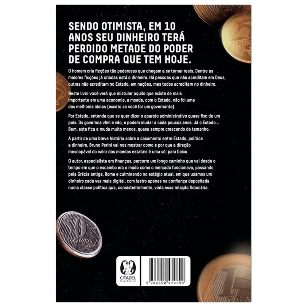 Neste livro, Bruno Perini explora como o dinheiro, uma das maiores ficções criadas pelo homem, se entrelaçou com o poder do Estado, resultando em consequências nem sempre positivas. Ao longo da história, a relação entre política, moeda e governo tem mostrado uma direção comum: o valor das moedas estatais tende a cair. Perini, especialista em finanças, traça essa jornada desde o escambo, passando pela Grécia e Roma antigas, até o sistema atual de moedas digitais, baseadas apenas na confiança em uma classe política que frequentemente quebra essa confiança.