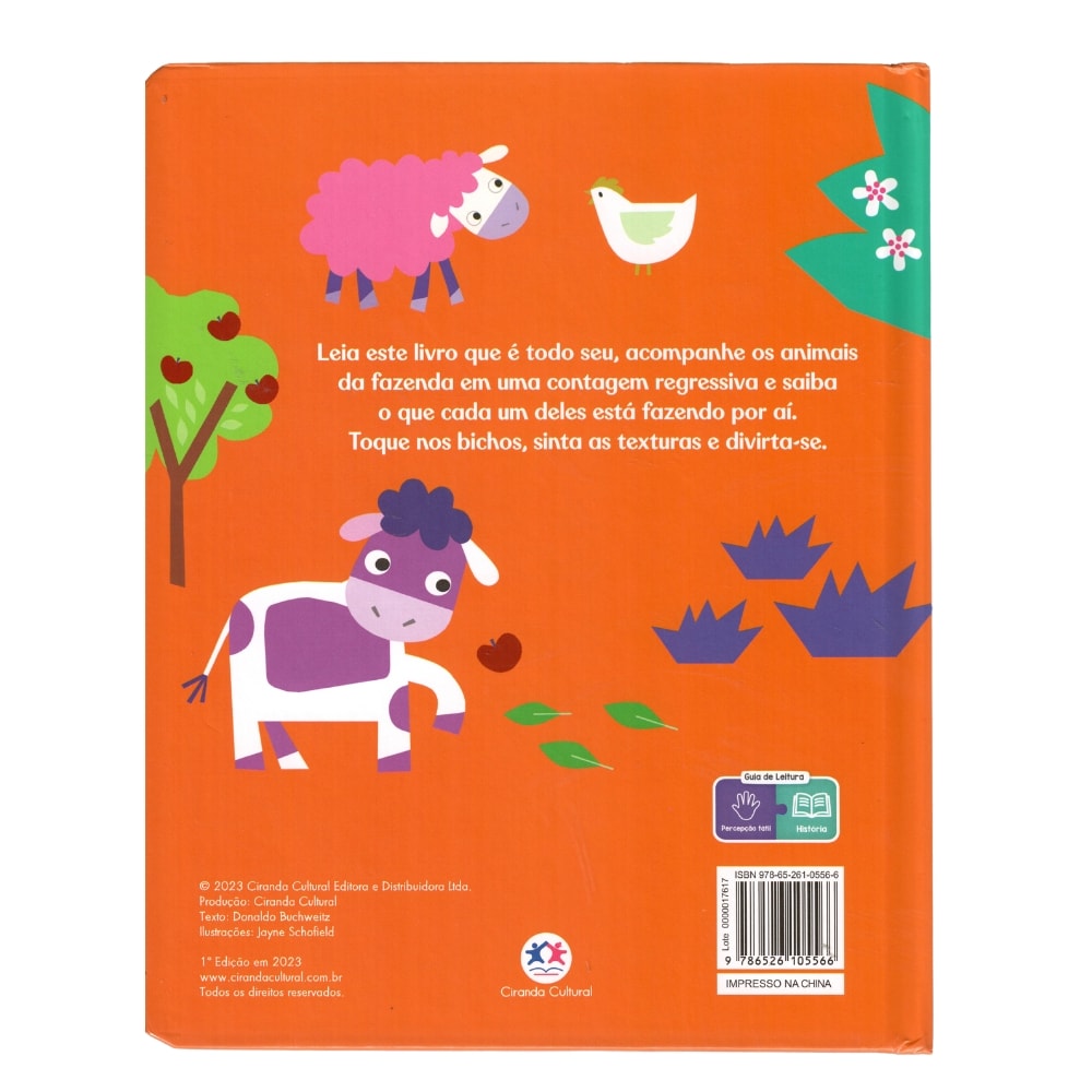 Acompanhe os animais da fazenda em uma contagem regressiva e saiba o que cada um deles está fazendo por aí. Leia este livro que é todo seu e sinta todas as texturas.