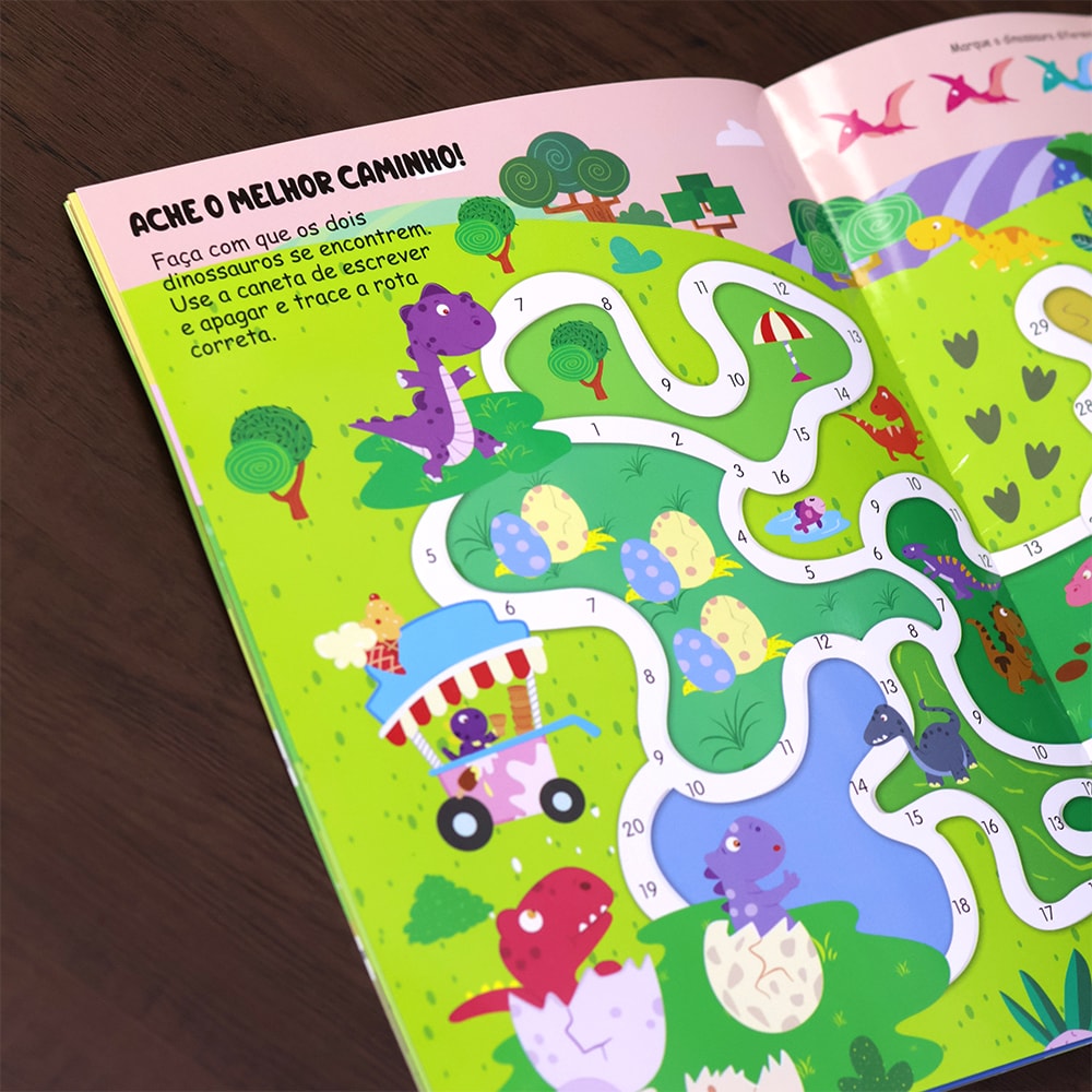 "Escreva e Apague - Estamos no Parque dos Dinossauros" é um livro interativo e fascinante projetado para crianças curiosas.