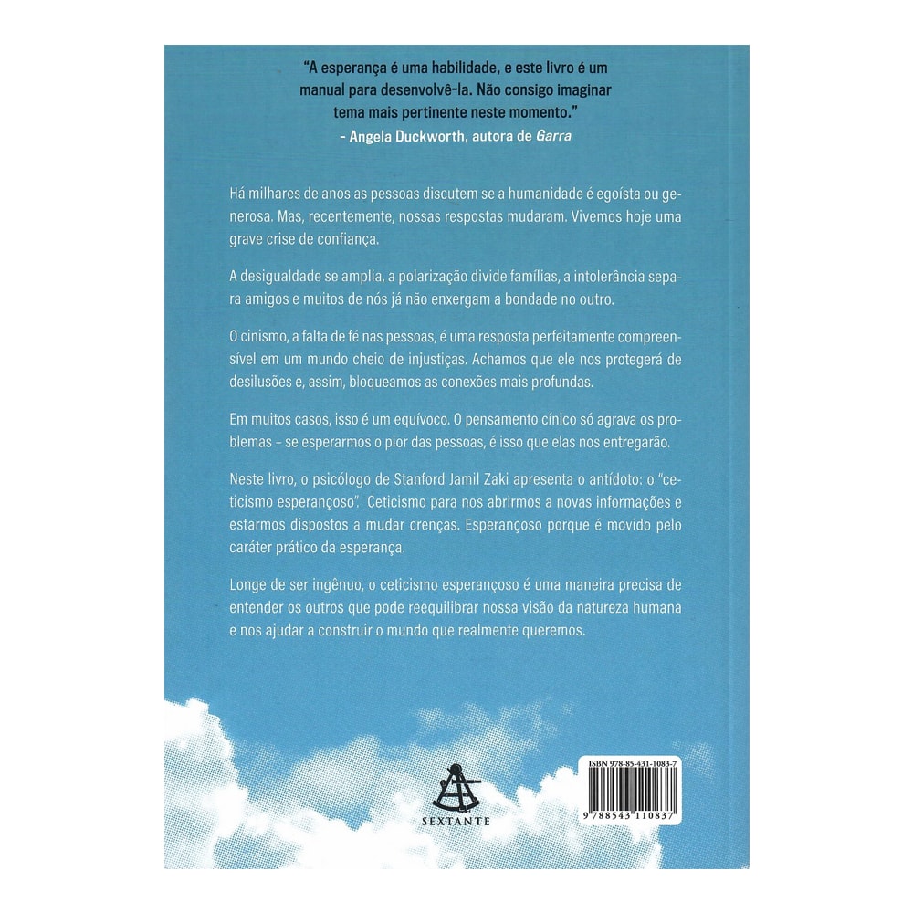 No livro, o psicólogo de Stanford Jamil Zaki propõe o “ceticismo esperançoso”: um olhar crítico aberto a novas informações, guiado pela esperança prática. Essa postura equilibrada nos ajuda a entender melhor as pessoas, superar o pessimismo e construir um mundo mais humano e conectado.