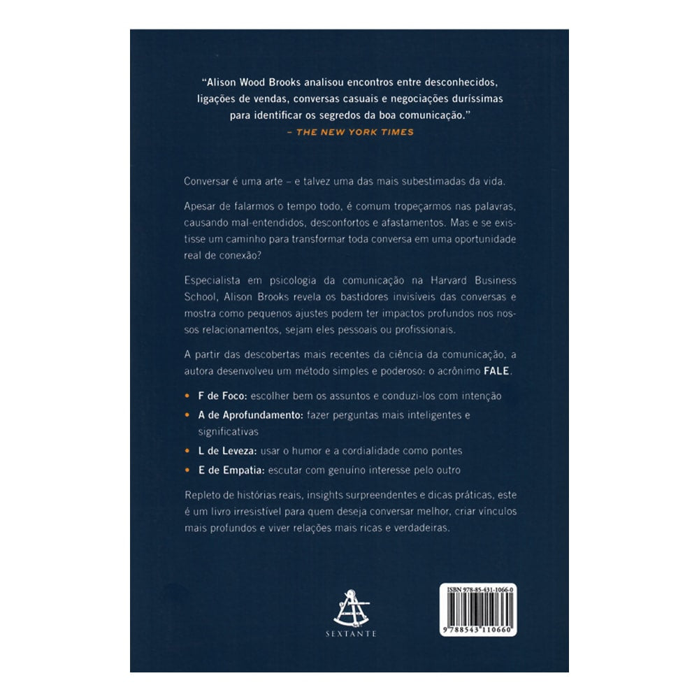 Falar bem é mais do que saber o que dizer — é saber se conectar. Combinando ciência, humor e histórias reais, Alison Brooks apresenta FALE, um método simples para transformar conversas em vínculos profundos. Baseado em anos de pesquisa em comunicação, o livro revela como foco, aprofundamento, leveza e empatia podem tornar qualquer diálogo mais verdadeiro e impactante — no trabalho, nas amizades ou no amor.