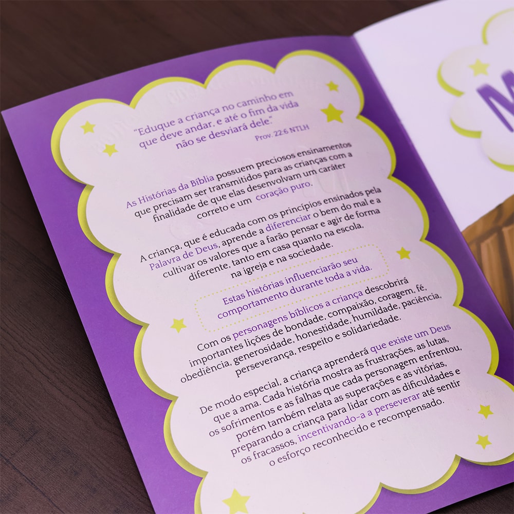 Este livro apresenta uma coletânea de histórias bíblicas recontadas de forma simples e envolvente, acompanhadas de belas ilustrações. Destinado a crianças, o objetivo é transmitir os primeiros valores espirituais e ensinar a importância do amor de Deus.